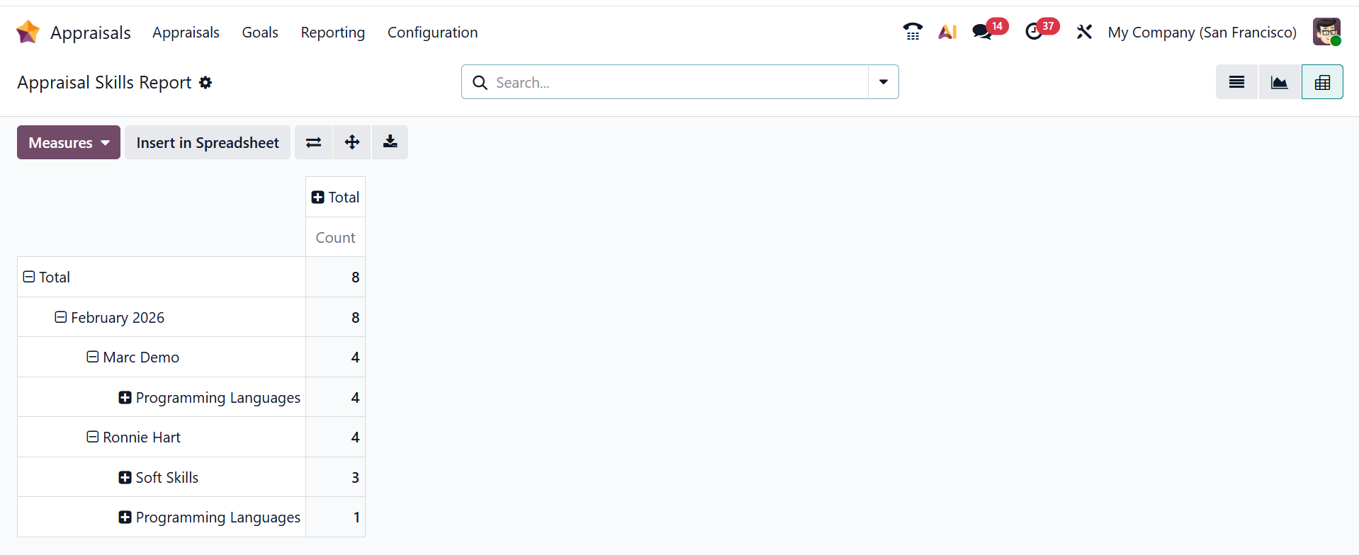In Odoo 19 Appraisals, Skill Evolution tracks how an employee’s skills improve over time based on appraisal results and feedback. Here, the skills evolution is arranged as a list view. You can also change it into Graph and Pivot views.