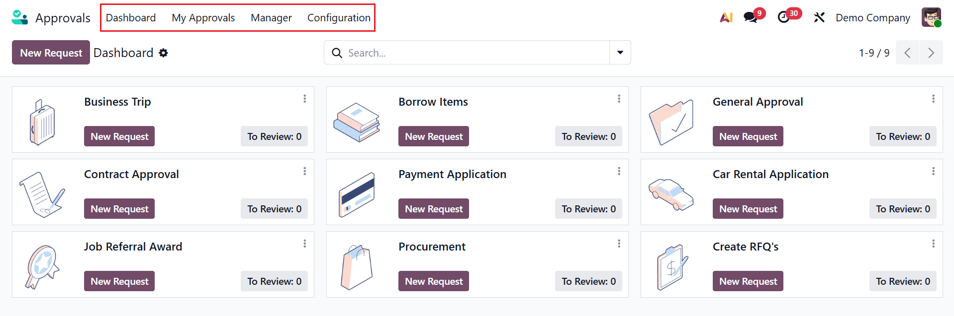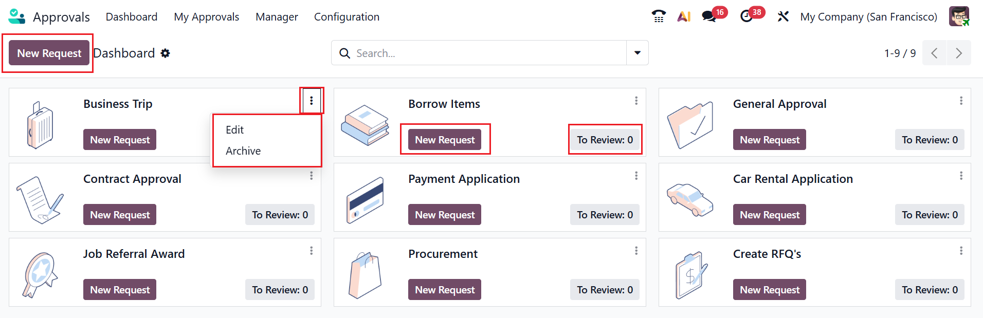 By default, the dashboard view of the Approvals module shows several approval types in a Kanban view. Each category is arranged as a card, where you can see the options such as New Request and To Review. The New Request button helps to create a new approval request under a specific category. You can review the approval status by clicking the To Review button. To Edit or Archive any approval category, click on the three-dotted vertical line in the right corner of each card. A new approval request can be created by clicking the New Request button.