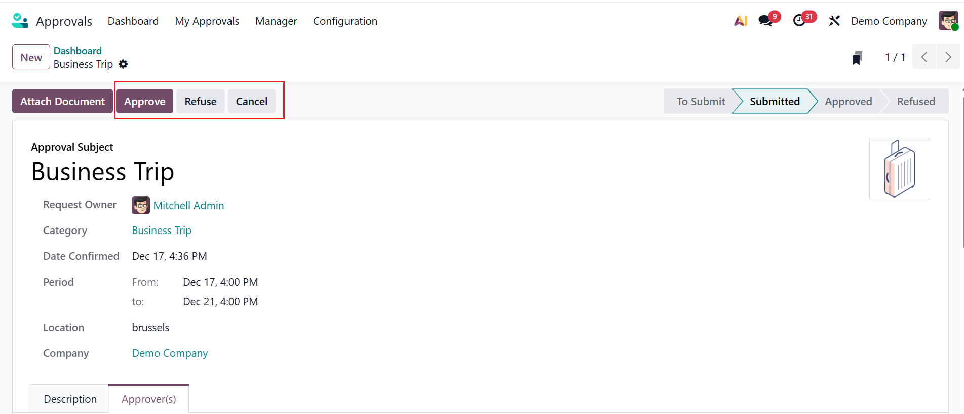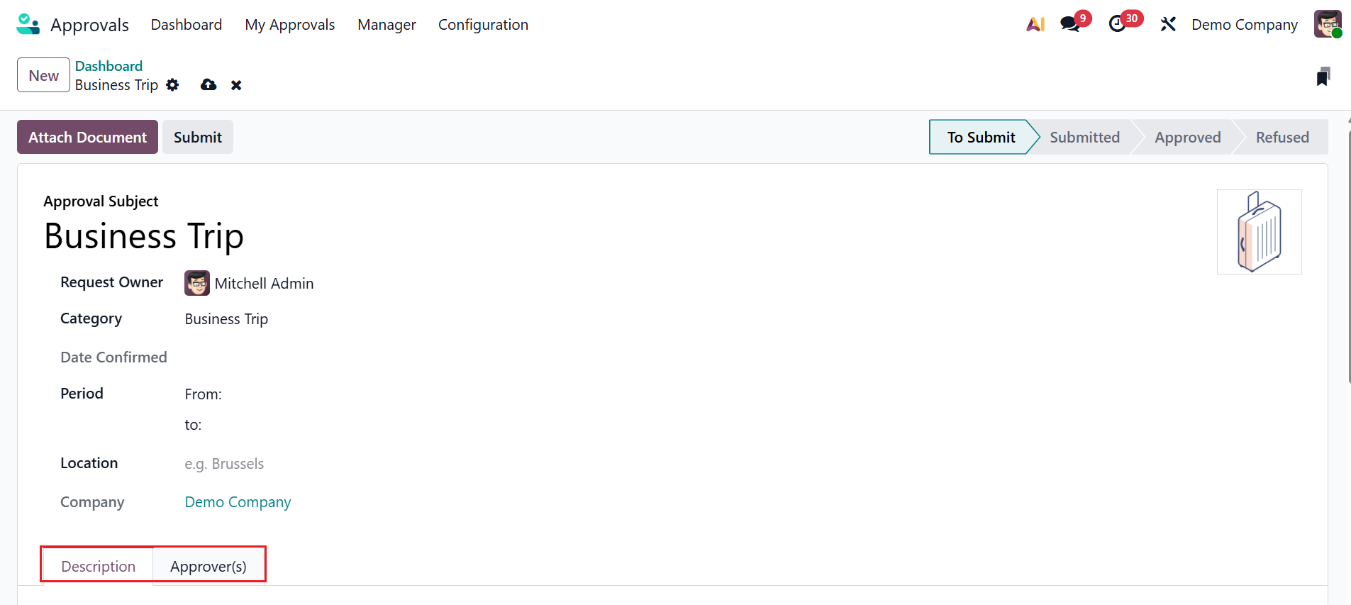 Then, add the details of the new request, such as Approval Subject, Category, Date Confirmed, Period, Location, and Company. Here, you can see two types of tabs: Description and Approver(s). Use the Description tab to provide additional details about the approval subject.