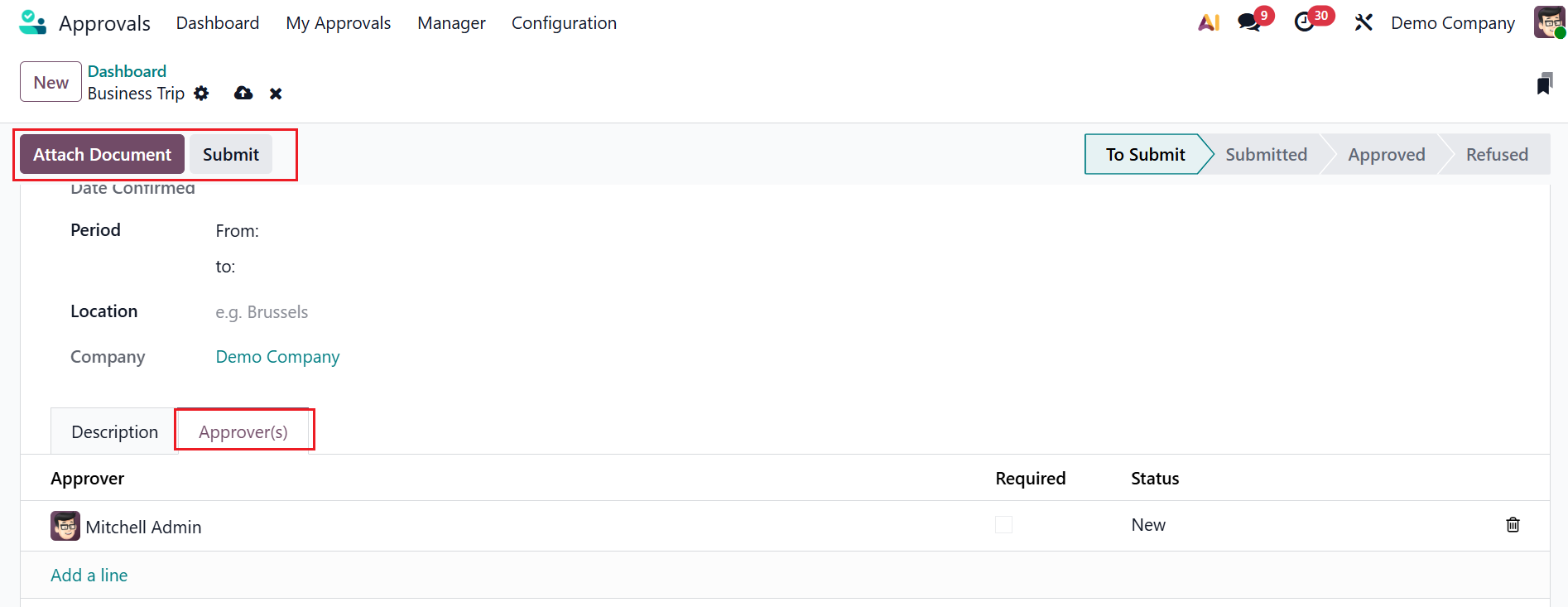 Under the Approver(s) tab, click on the Add a line button to add an Approver. Enable the Required field to set the approver as mandatory. You can also view the approver's Status. To attach a document, select the Attach Document button. Click Submit to save the request. From the To Submit stage, it will move to the Submitted stage.