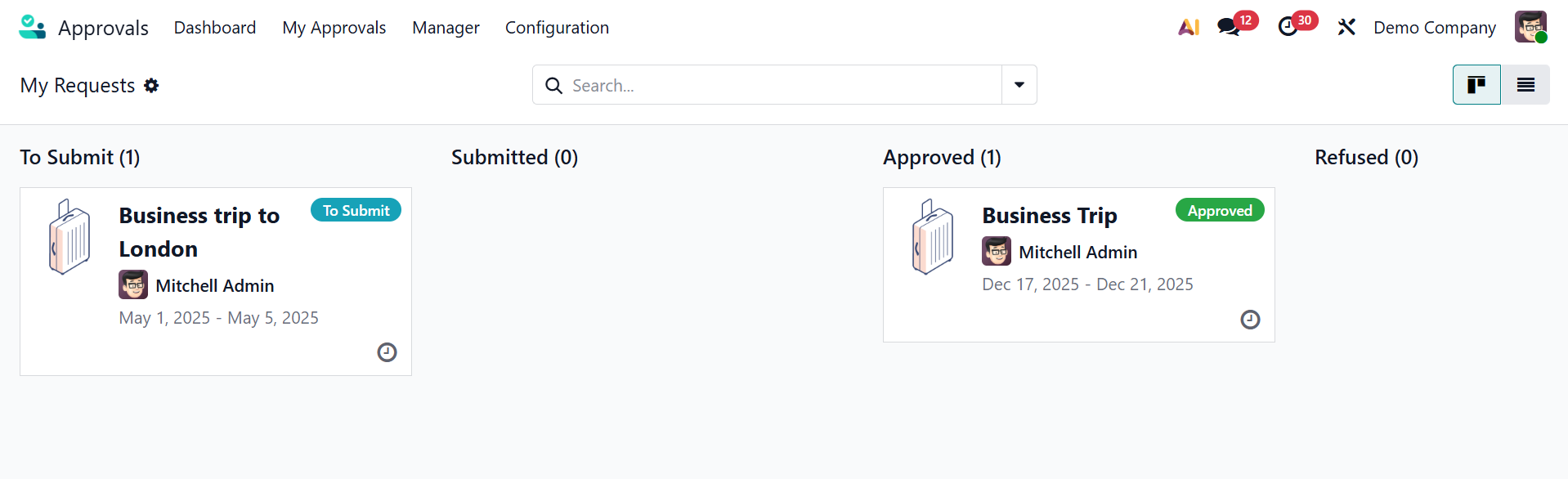 In the My Approval dashboard, you can see the request created by the logged-in user. The approval stages are To Submit, Submitted, Approved, Refused, and Cancelled. Each stage is arranged as a Kanban view, and you can also switch to a list view. Each card includes details such as the Approval subject, Request Owner, Period, and request status. To schedule an activity, click the clock icon for the selected approval. The Settings icon in the top-right corner of the kanban card allows you to fold and automate request stages.
