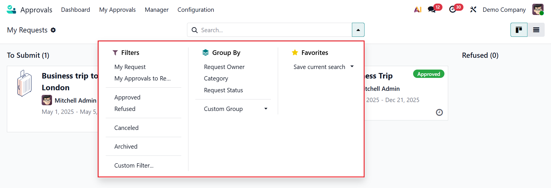Click on the drop-down menu in the search bar to view options such as Filters, Group By, and Favorites. The Filters section includes My Request, My Approval To Review, Approved, Refused, Canceled, Archived, and Custom Filter options. The Group By section includes Request Owner, Category, Request Status, and Custom Group. The Favorites section helps you save the search for future use.