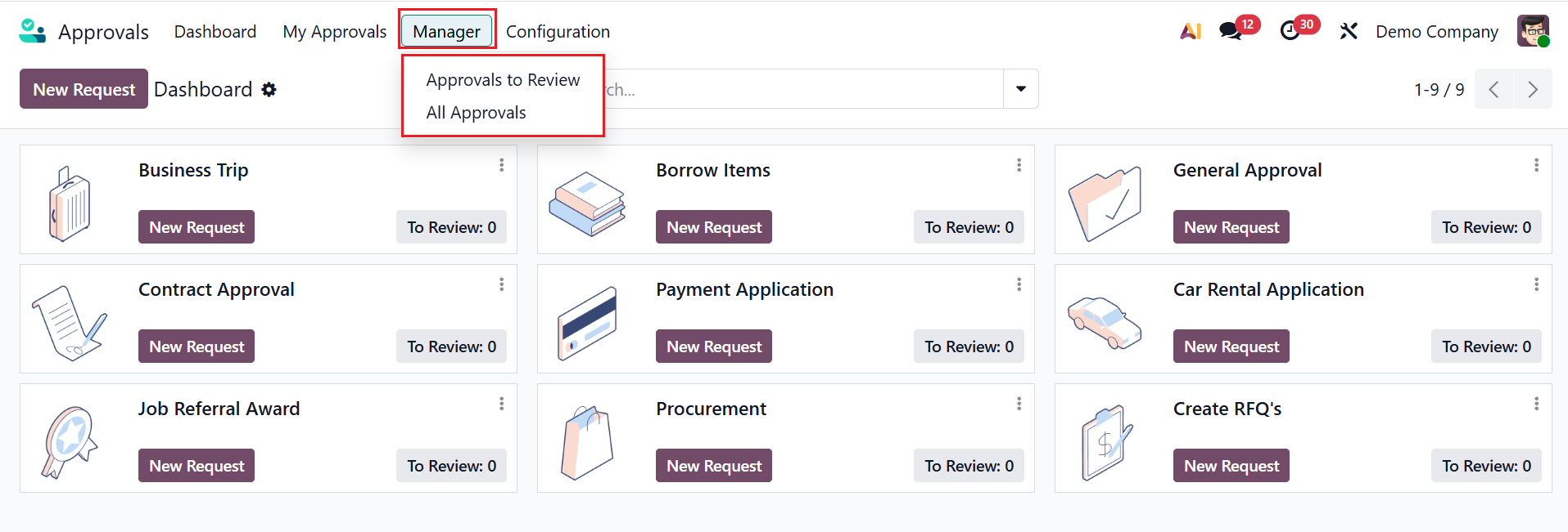 In the Approval module, you can see four types of menus: Dashboard, My Approvals, Manager, and Configuration.