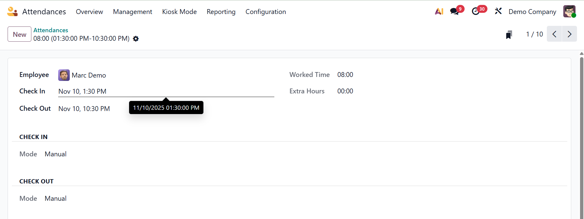 The employee's details, including name, hours worked, overtime, and check-in and check-out times, are displayed when an attendance is opened. Examples of additional check-in information include the browser, IP address, check-in mode, localization, and GPS coordinates.