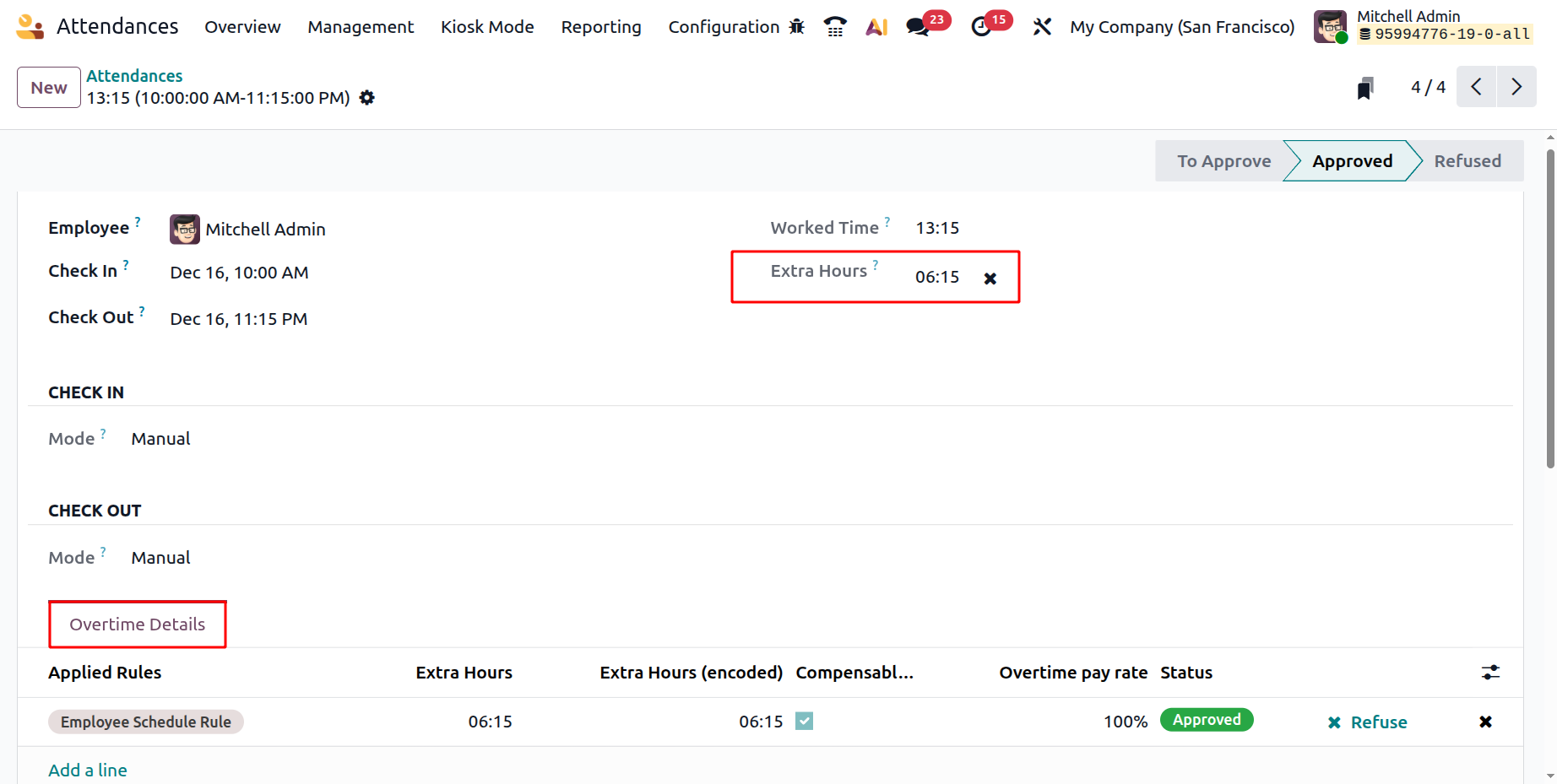Overtime Details defines and monitors time worked beyond regular business hours, computes additional compensation, oversees compliance, and automates procedures such as authorizing overtime (e.g., 1.5x pay for weekend shifts), establishing daily/weekly limits, and connecting to payroll, frequently using rules based on recorded check-ins and check-outs and corporate policies. If the cross icon is clicked in the extra hours option, then the overtime will be refused