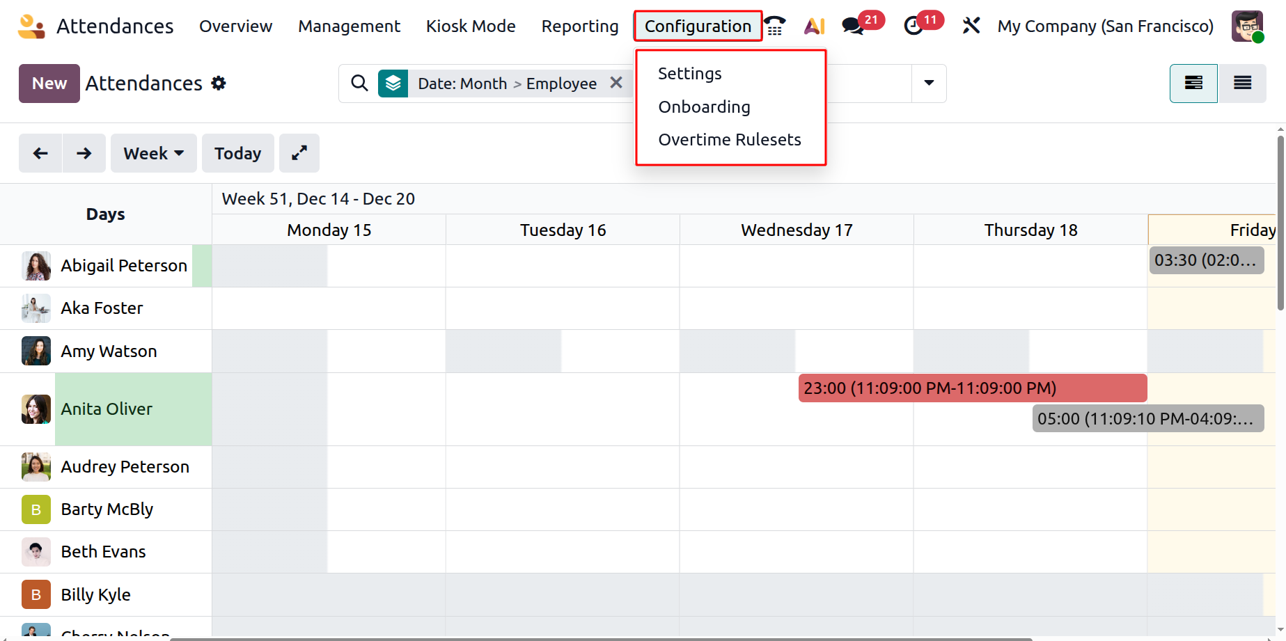 Odoo 19 Attendance's Configuration feature allows users to control additional settings about employee attendance. When the user selects the Configurations tab, options such as Settings, Onboarding, and Overtime rulesets are available.