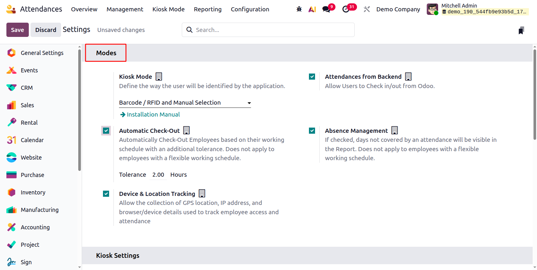 In the Kiosk Mode section, users can alter how the kiosk program will recognize them after selecting a Mode. Users can then log in and out of Odoo using the Attendances from Backend capability.