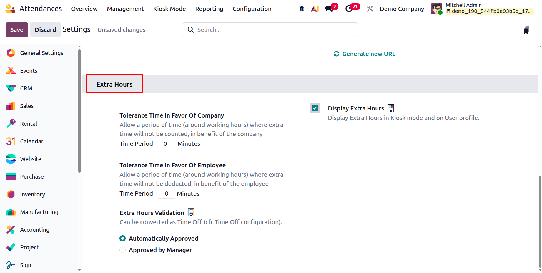 Managing the Extra Hours that have been set up in the Odoo 19 Attendance module comes next. You can set a tolerance period that benefits both the employer and the employee under the Extra Hours option. You can immediately assign the company-specific working hours within the Tolerance Time in Favor of the Company. The Tolerance Time in Favor of Employee column should also include the time that benefits an employee and from which additional time is not subtracted. The option to "Display Extra Hours" shows extra hours both on the user profile and in kiosk mode. Additionally, time off is converted using the Extra Hours Validation option. The manager may approve it or it may be approved automatically.