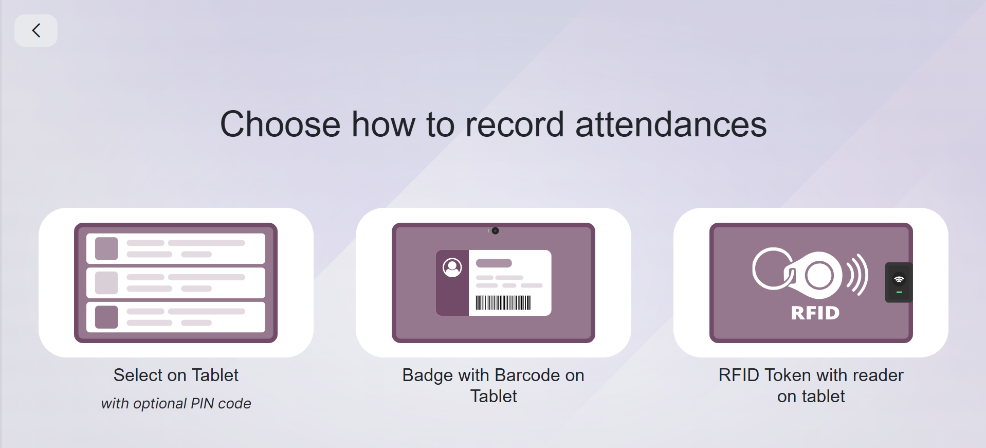 - Select on Tablet with Optional PIN Code: Employees check in or out by selecting their name on a shared tablet and optionally entering a personal PIN for verification.