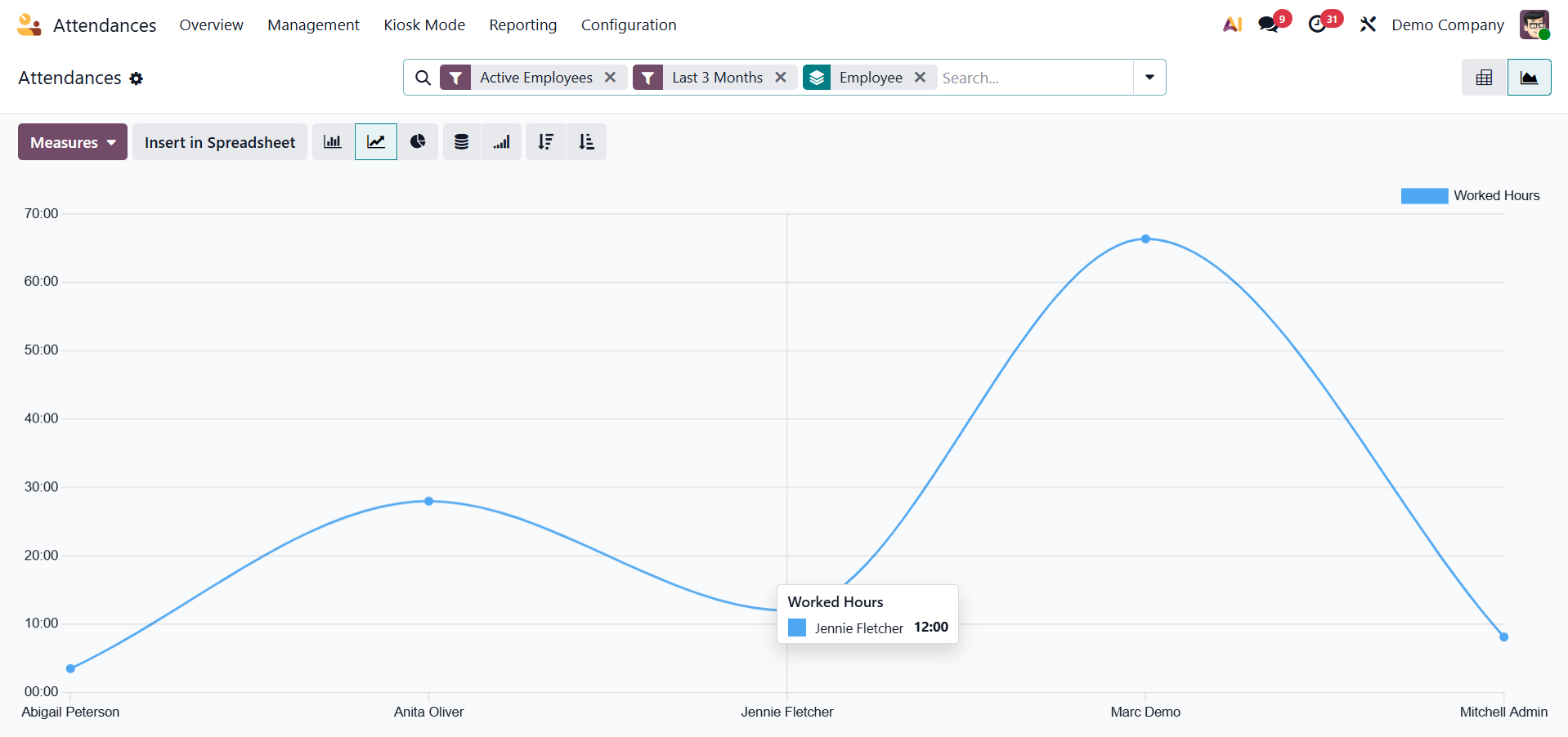 The Attendance Analysis window's graph displays the employee check-in data on the X-axis and the count on the Y-axis. The graphical depiction allows users to see each employee's check-in details in a variety of colors. We may add specific numbers to the graph, such as the number of hours worked and employee overtime, by selecting the MEASURES icon.