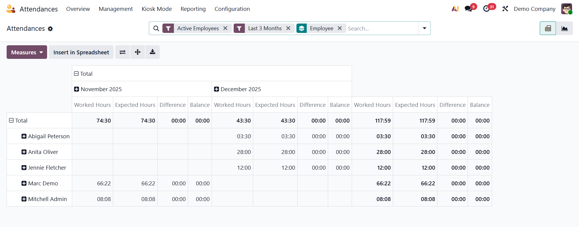 It is possible for users to generate staff attendance records on a weekly, monthly, or annual basis. Select the Reporting tab in Odoo 19 Attendance to view attendance analysis results and Time Off Ledgers.
