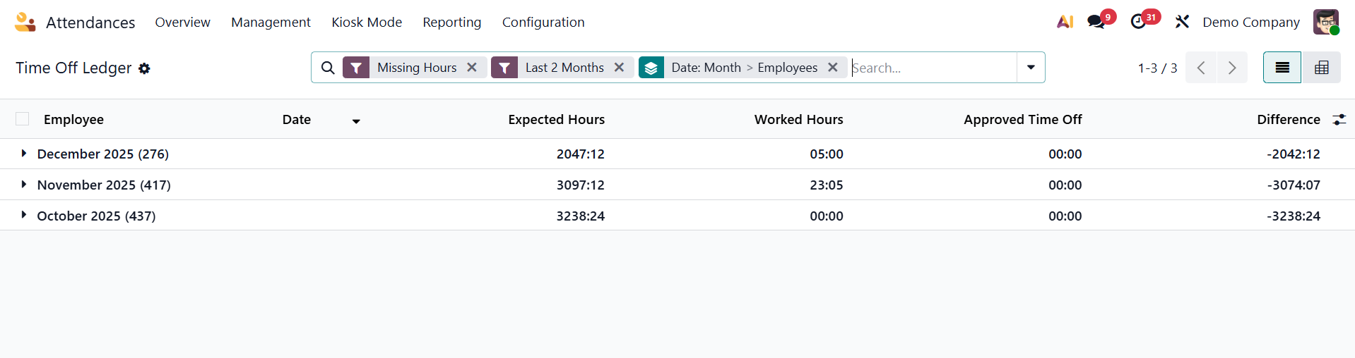 HR teams can monitor how time off affects attendance and working hours by using the Time Off Ledger option in the Reporting menu of Odoo 19 Attendance, which offers a comprehensive picture of workers' validated leave allocations, leave taken, and remaining balances.