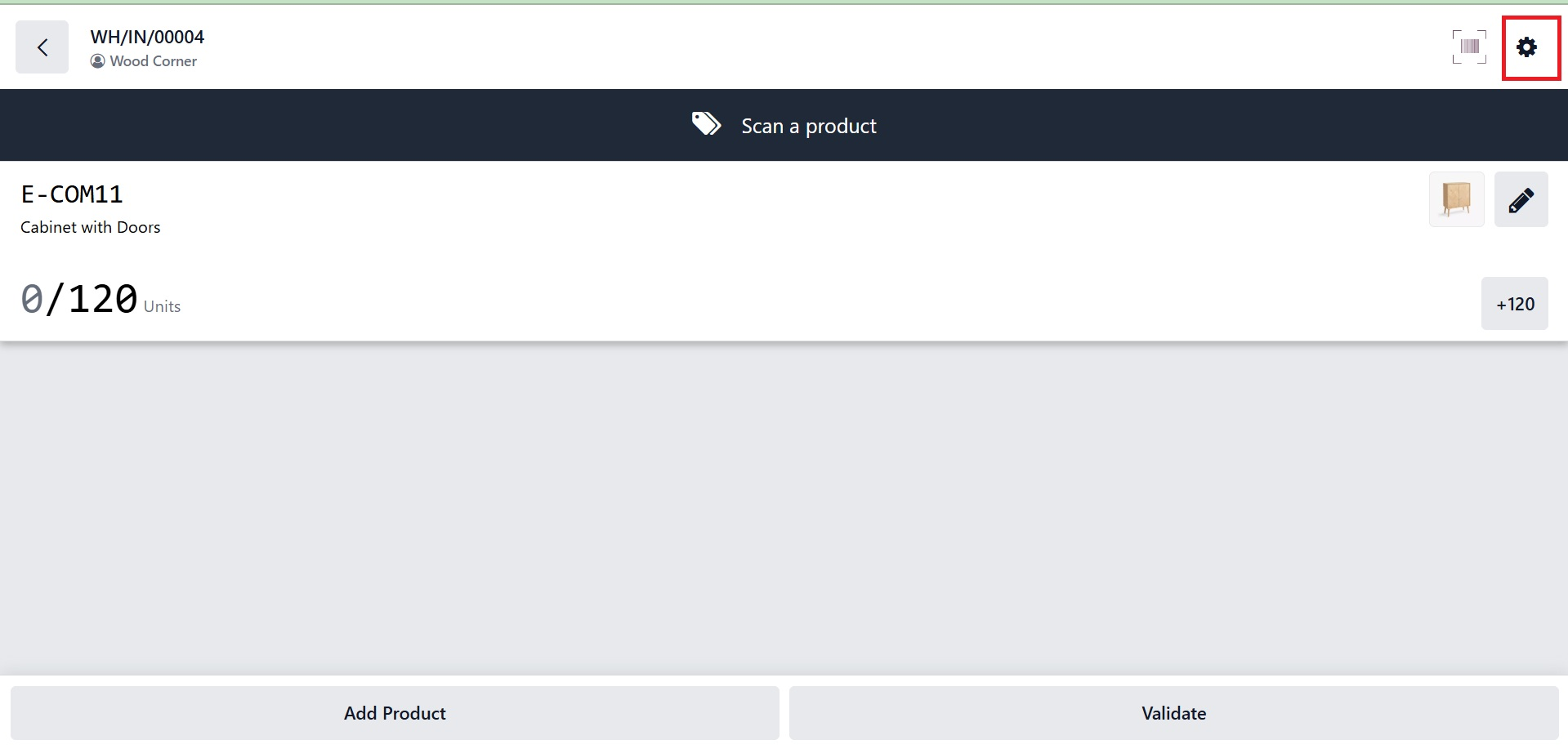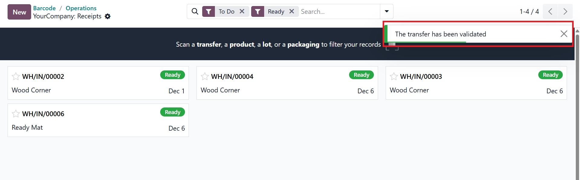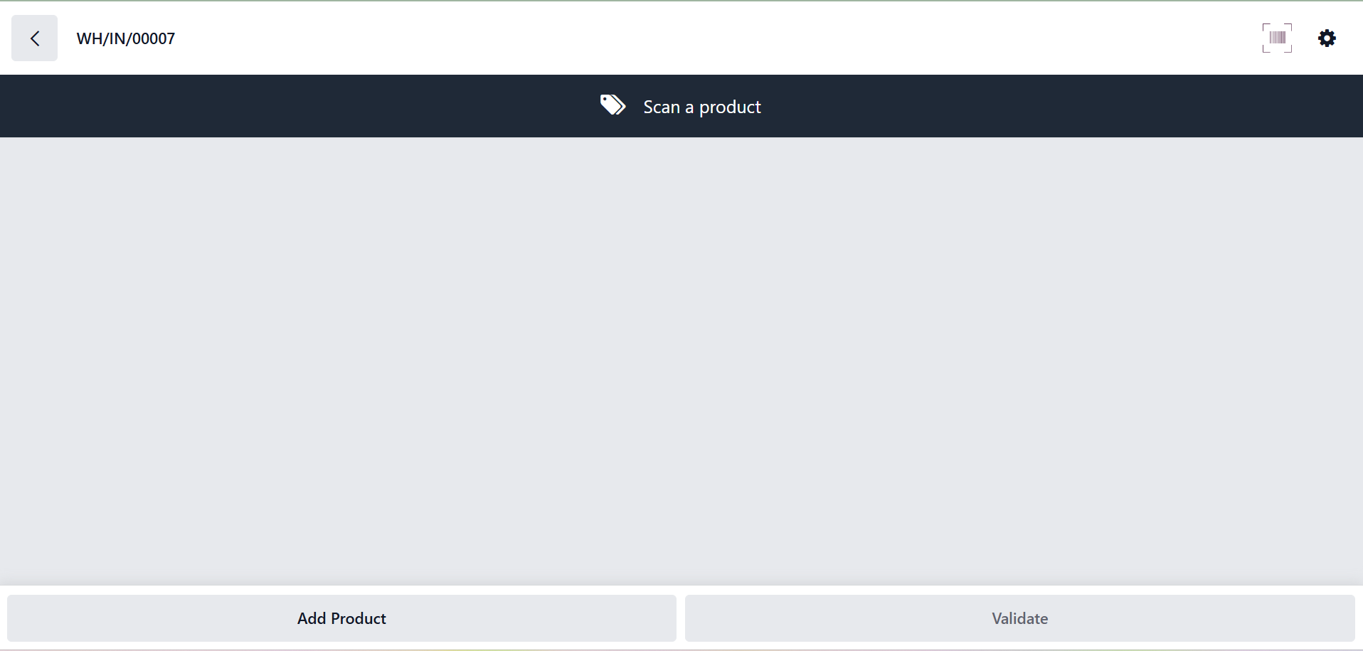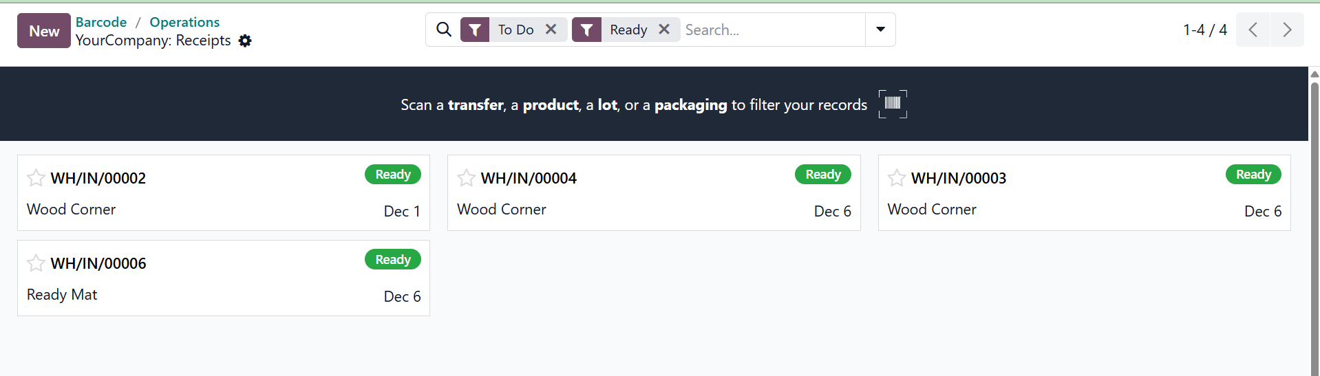When the "New" button is clicked, a new receipt is created, enabling barcode scanning to automatically add products and update warehouse locations and product names.