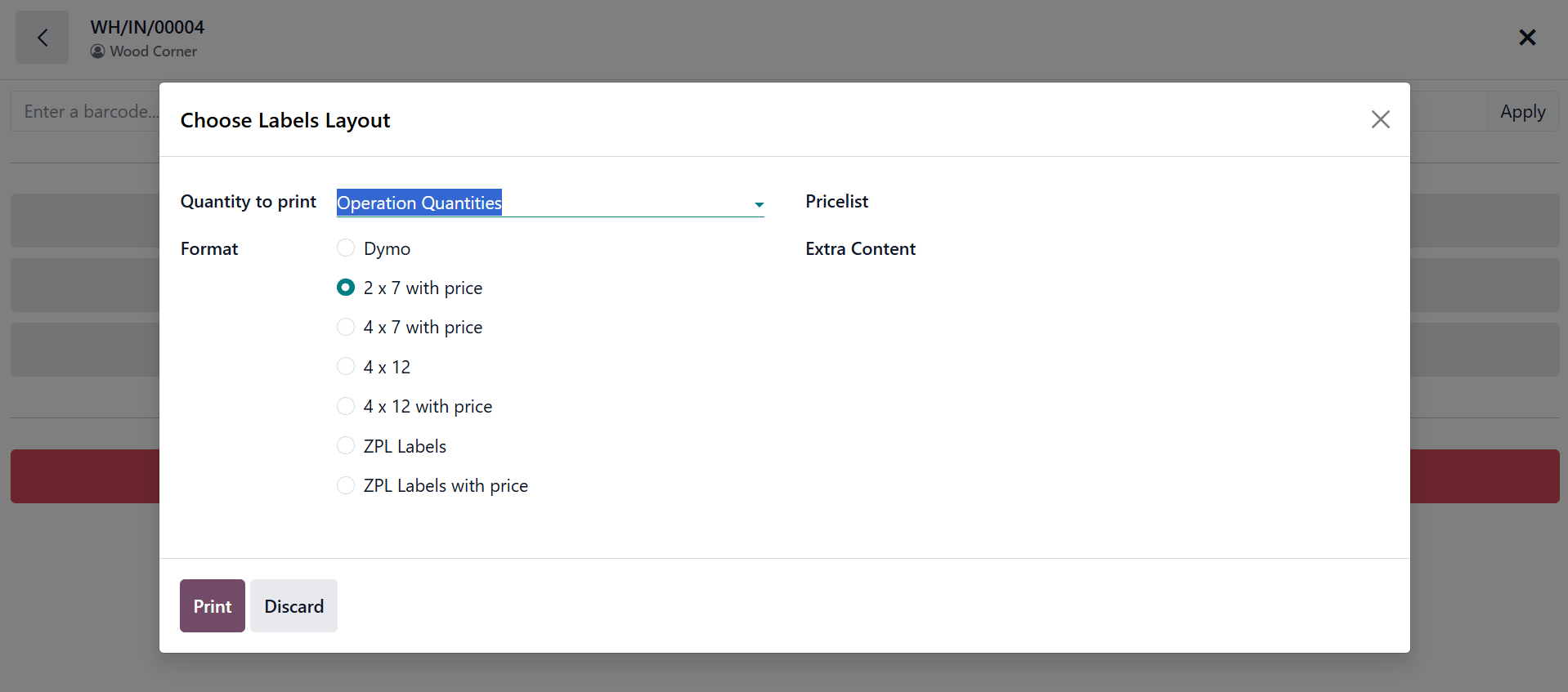 The barcode labels for the specific operation can be printed using the "Print Barcodes" button. When you click on this, a pop-up box with the Quantity to print, Format, Pricelist, and Extra Content options will appear, allowing you to alter the layout of the barcode labels as seen below.