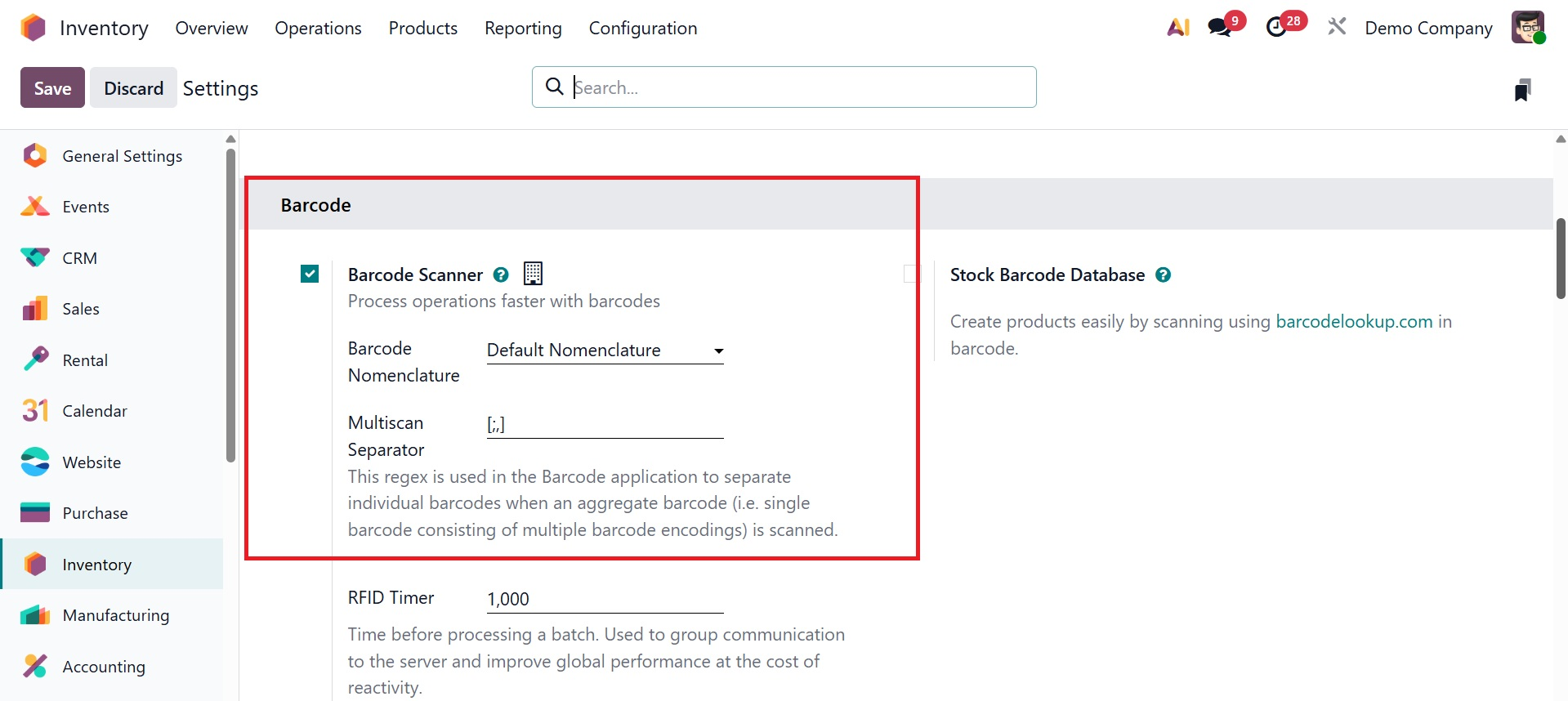 By making sure the Inventory Module is installed, users in Odoo 19 can swiftly verify a product's barcode. They must go to the Inventory Module's Configuration menu's Operations Settings section. Next, select Configure Product Barcode after turning on the Barcode option.