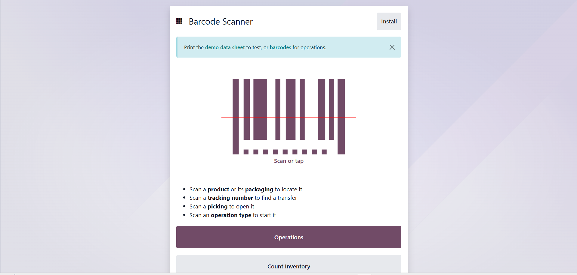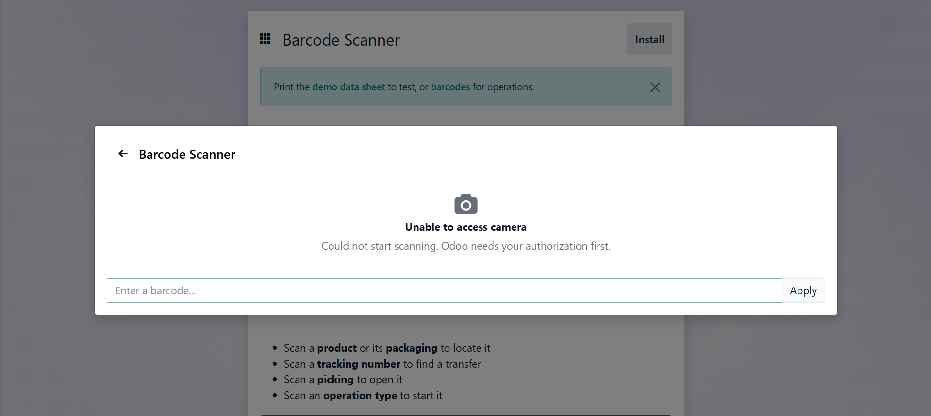 Click the Barcode App icon in the Odoo 19 dashboard to launch the Barcode App when it has been installed. Additionally, the Inventory App, which is essential to barcode-related procedures, must be accessible to the user in order to enable barcode functionality. As seen in the screenshot below, a Barcode Scanner interface will appear when the program interface is opened.