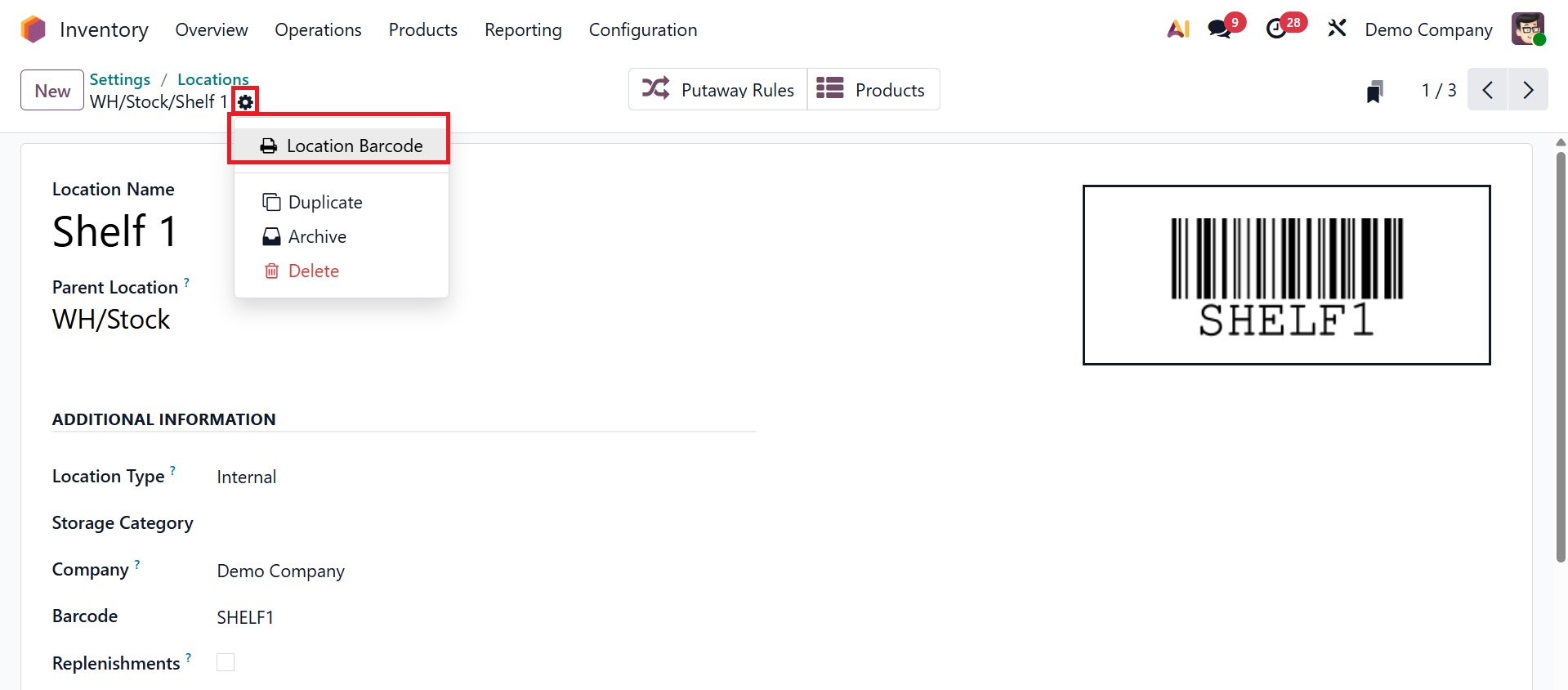 Users can assign barcodes to various warehouse locations to improve inventory organization. To examine current locations or create new ones, navigate to the Inventory Module, select the Configuration menu, and select the "Locations" option from the Warehouse Management section.