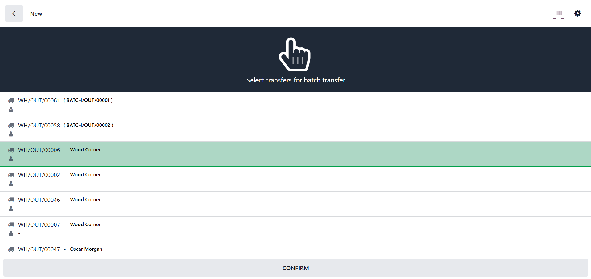 Click the "New" button to start a new batch transfer. In order to select the necessary transfers for a new batch transfer and validate the transfer using the "CONFIRM" button, as demonstrated below, this will open the list of all the available batches.