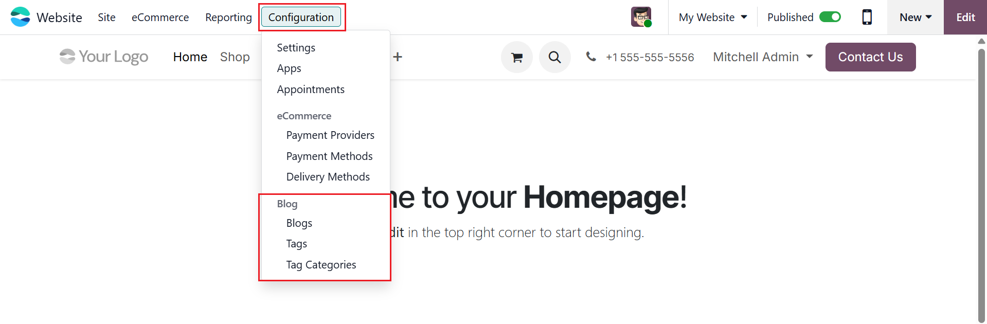 You can create and manage blogs in the Website module of the Odoo 19 dashboard. The Blog menu is available under the Configuration tab. As shown in the screenshot below, the Blog menu has three options: Blogs, Tags, and Tag Categories.