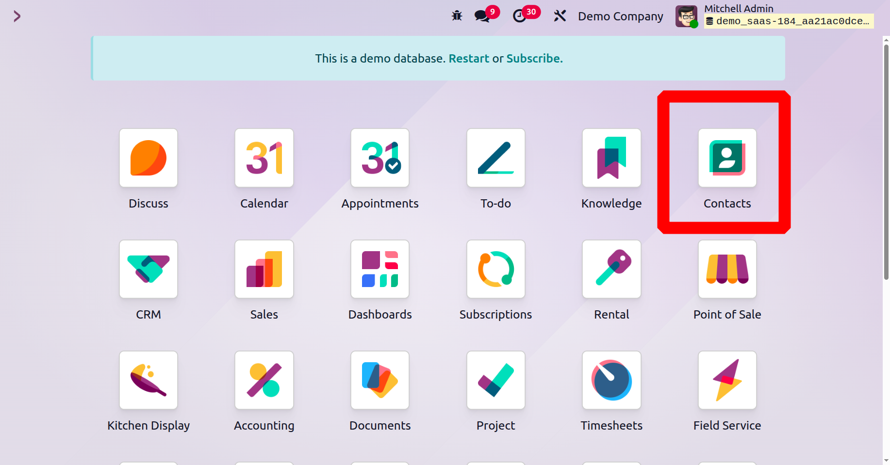 The Contacts module in the Odoo 19 ERP system helps you keep all your contacts organized in a single place. This module is an essential tool for effective business management, as it allows you to manage customers, vendors, partners, and other professional connections with ease. You can access the Contacts module directly from the main Odoo dashboard, and once opened, it provides a clear and user-friendly interface.