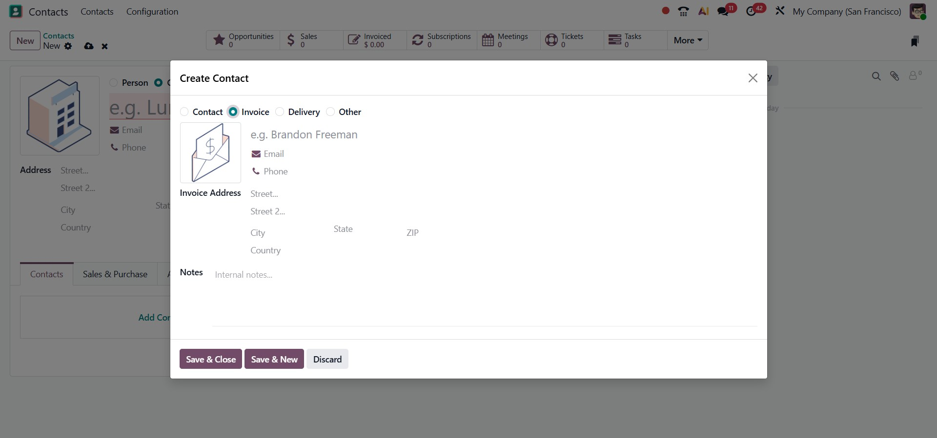 The pop-up window provides options to add different types of addresses or related contacts linked to the main record. You can choose from Contact, Invoice, Delivery, or Other according to your business needs.