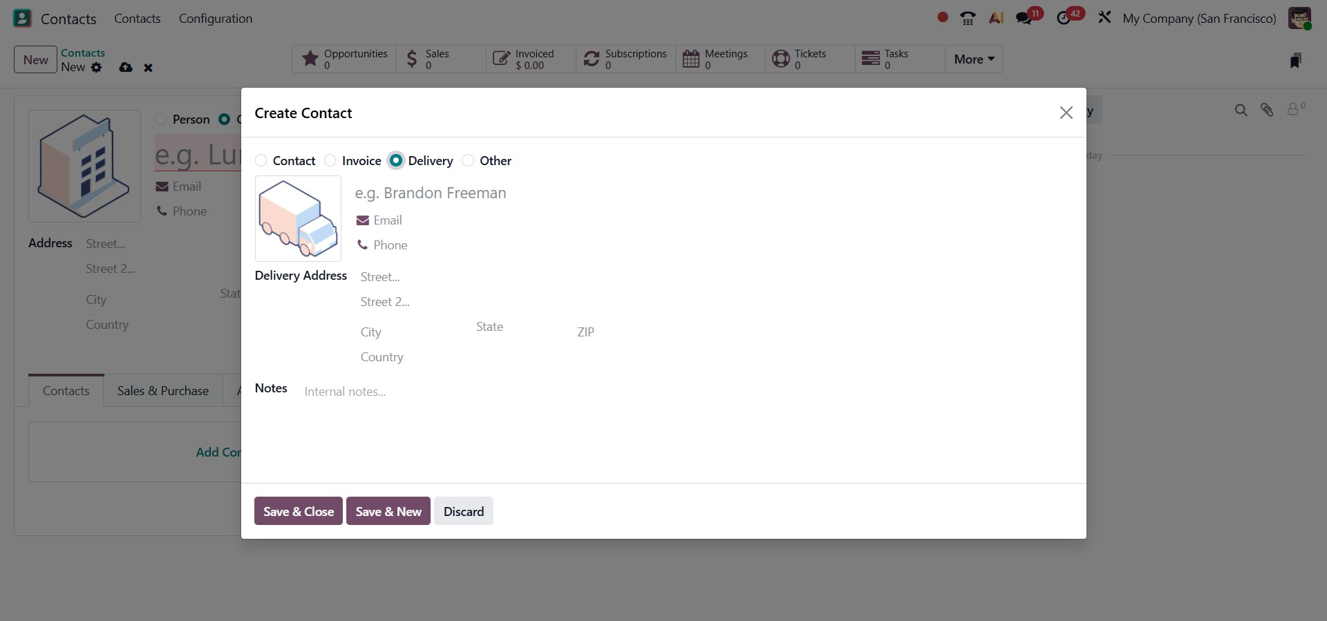 - Delivery: This option sets up a delivery address for the contact. It determines the location where products or services will be shipped.
