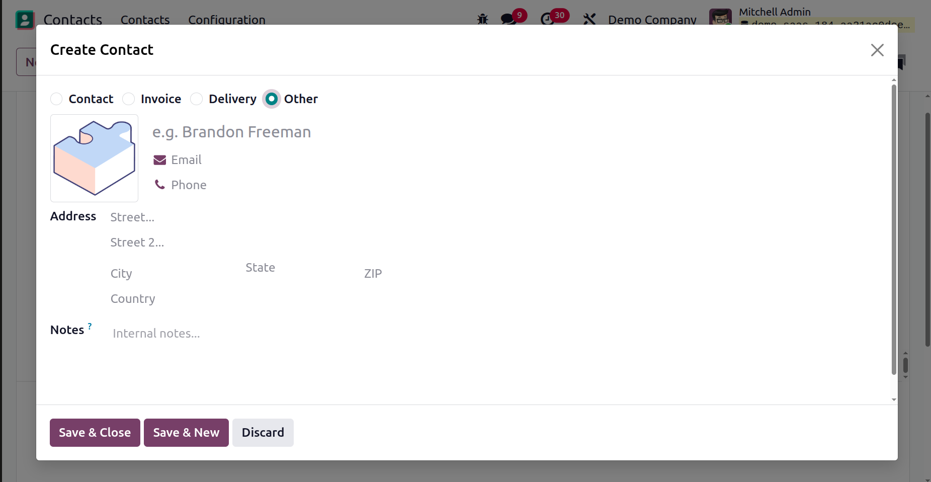 Enter the Contact person's address, email, phone, and mobile number after choosing the Other Address option. After adding all details, click the Save & Close button, as indicated in the screenshot above.