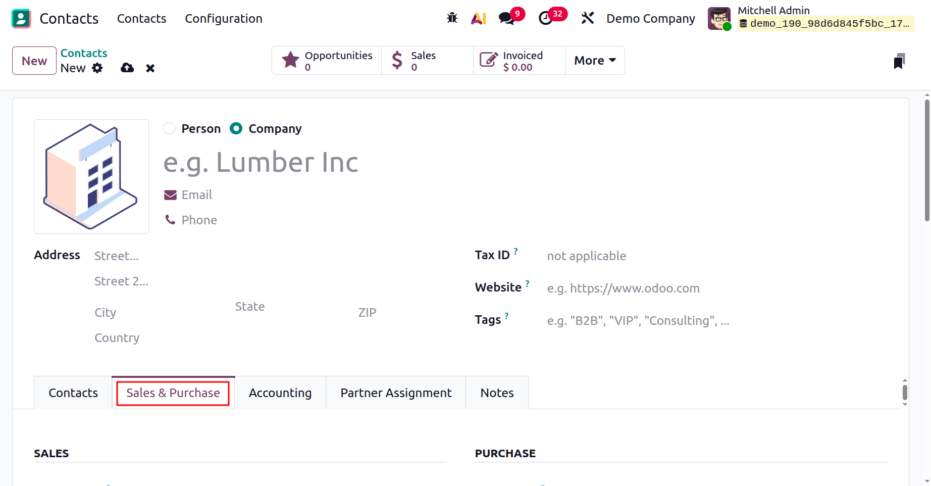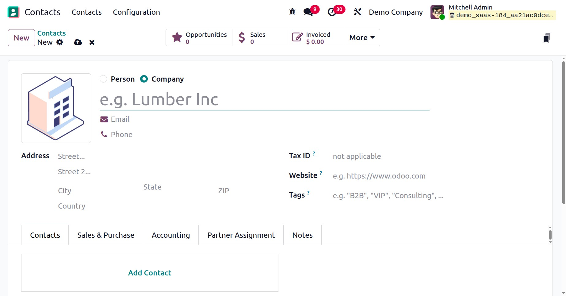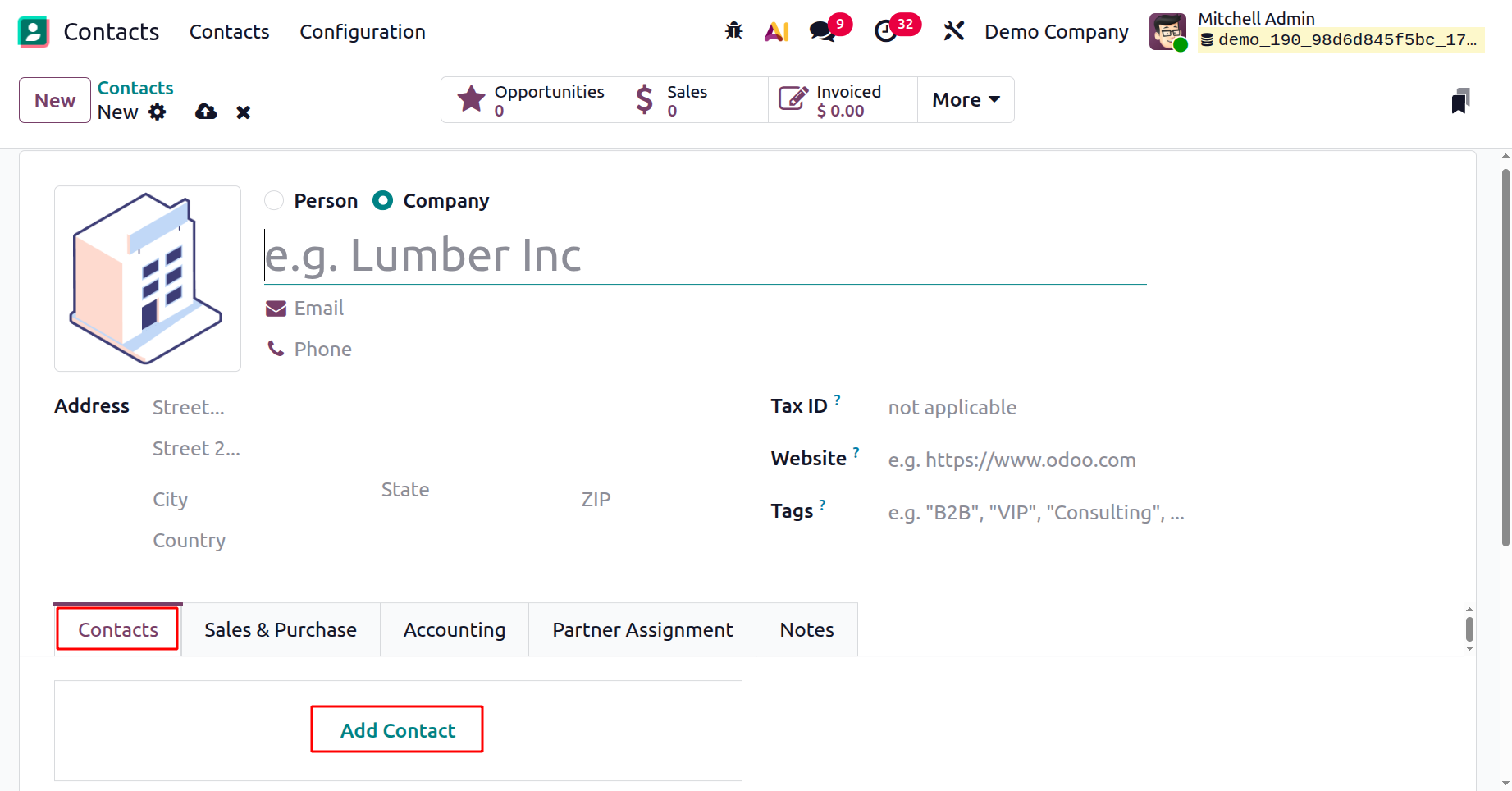 Clicking the New button will bring up a form view, as illustrated in the screenshot below. This form allows you to provide all pertinent information about the contact. In Odoo 19, the process of creating a new contact is similar to adding a new customer, with fields provided for entering both personal and company-related information.