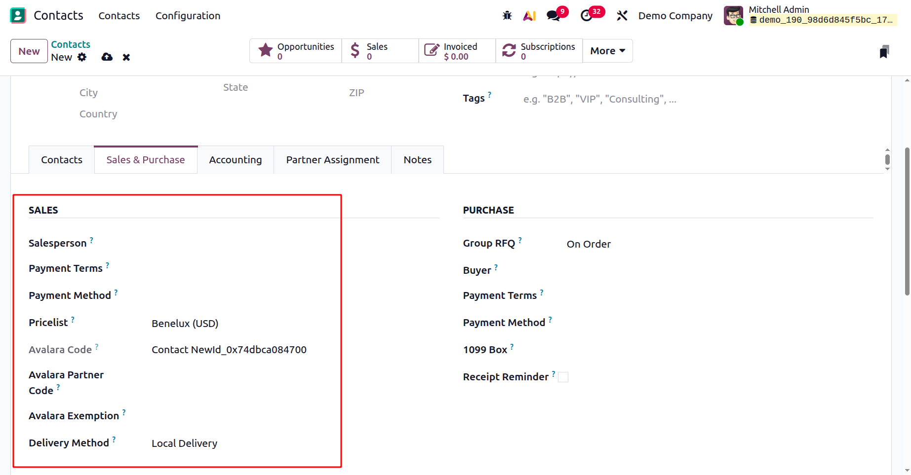 The tab also allows you to choose a Price List that will apply to sales transactions with the contact. If your company uses Avalara for tax management, you can link the contact by entering the Avalara Partner Code and Avalara Exemption. These fields ensure that the customer’s tax codes align with Avalara’s system, and they can be cross-referenced through the Avalara gateway for accurate tax handling. Additionally, a Delivery Method can be set in this tab to define the preferred shipping or delivery process for all of the contact’s sales orders. By configuring these fields, businesses can streamline sales operations and ensure that every order is processed according to customer-specific requirements.