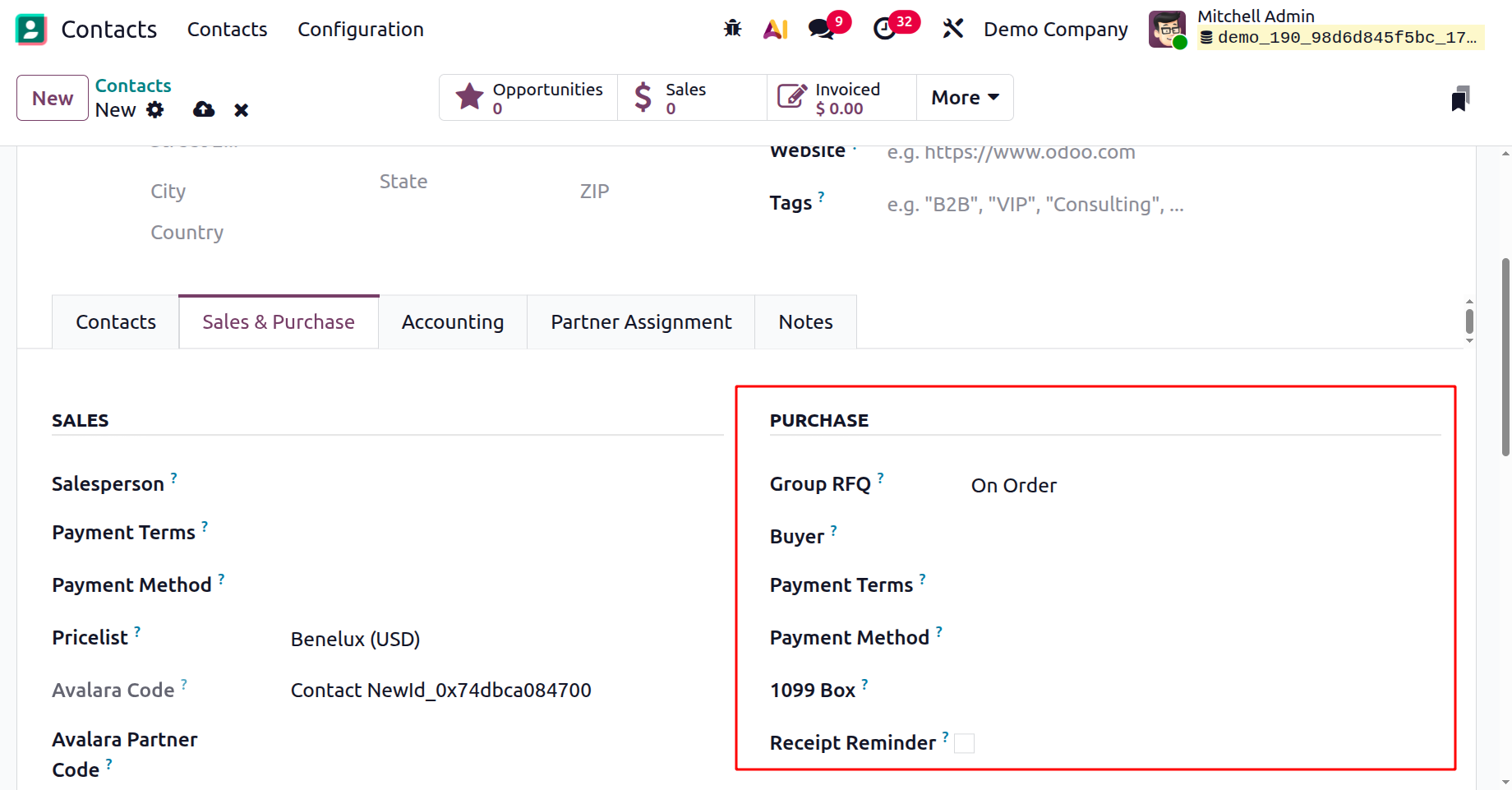 Next, you will find several fields that help manage financial transactions related to the contact. The 1099 Box option allows you to specify where the journal entries for this contact should be reported in the 1099 report. You can also define the Supplier Currency to be used for purchases, select Payment Terms for purchase orders and vendor bills, and set the preferred Payment Method for paying this contact. By enabling the Receipt Reminder option, the system will automatically send an email to the contact asking them to confirm the exact receipt time before the expected delivery date.