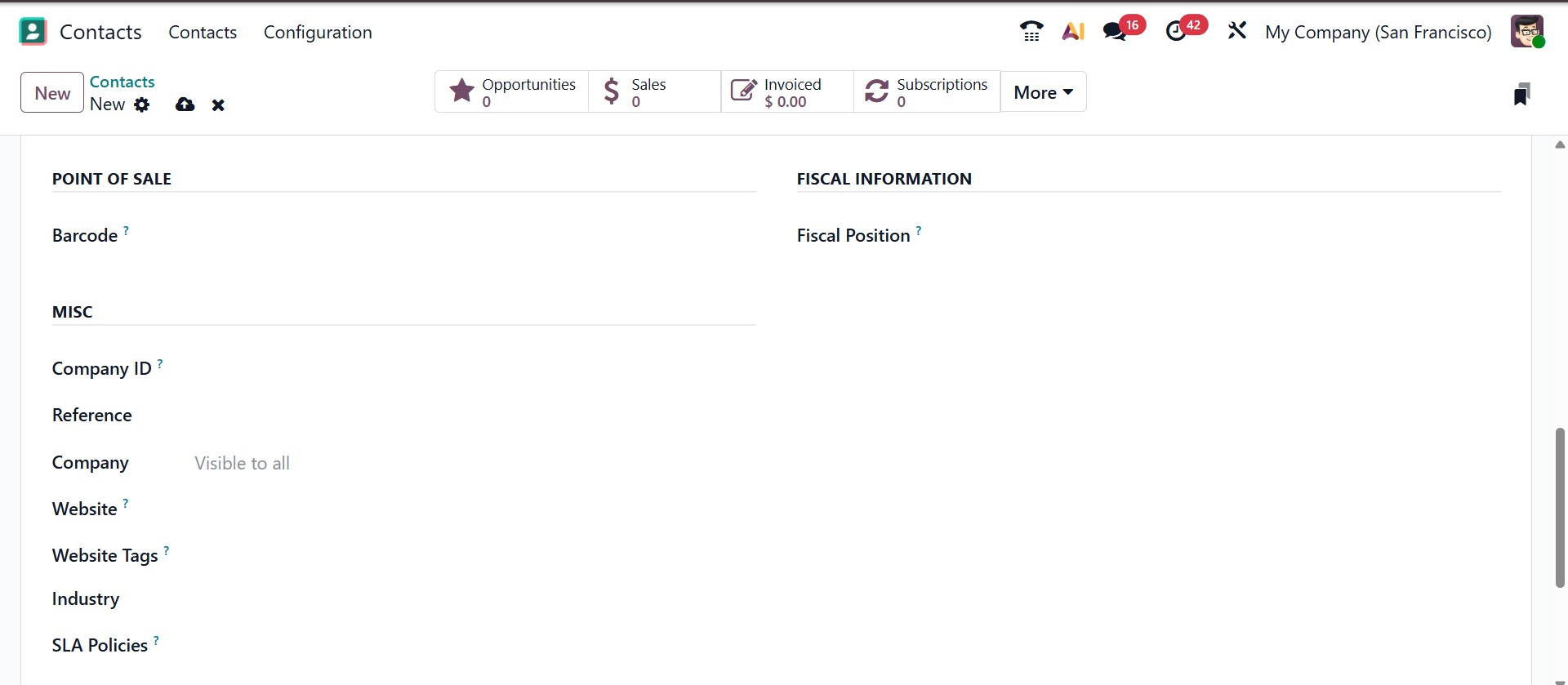 In the Point of Sale (POS) section, you can assign a Barcode to identify the contact during sales transactions. The Fiscal Information section allows you to configure the Fiscal Position, ensuring that the correct taxes and accounts are applied to the contact’s transactions.