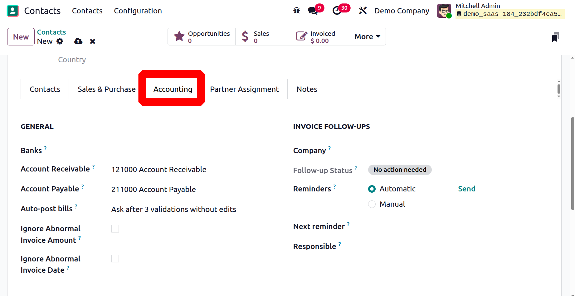 You can configure all the details required for the contact’s accounting procedures under the Accounting tab.