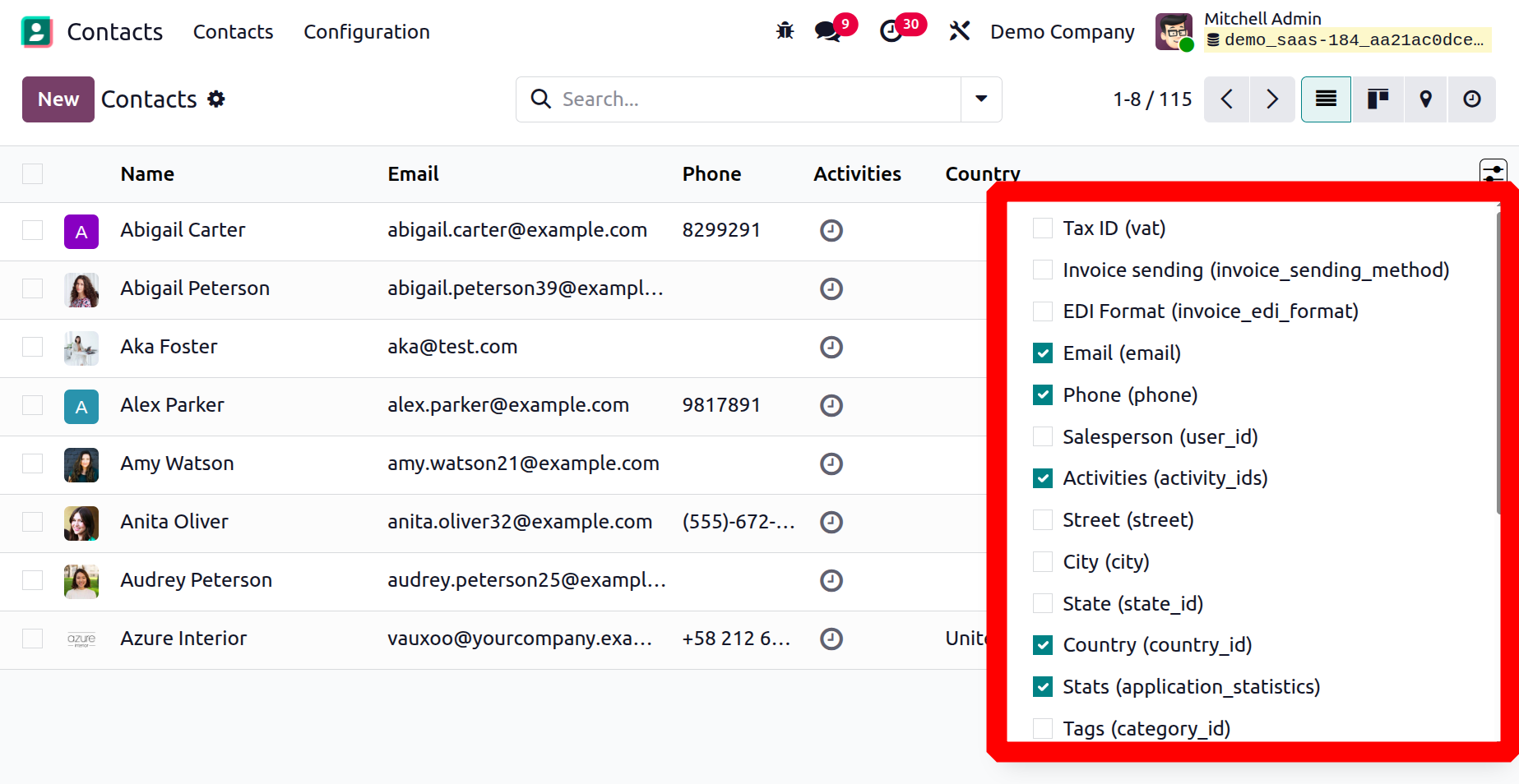 The List view of the Contacts dashboard in Odoo 19 displays all contacts in a structured table format. This view makes it easier to quickly scan and filter information. The main fields shown in the list include Name, Email, Phone, Activities, and Country.