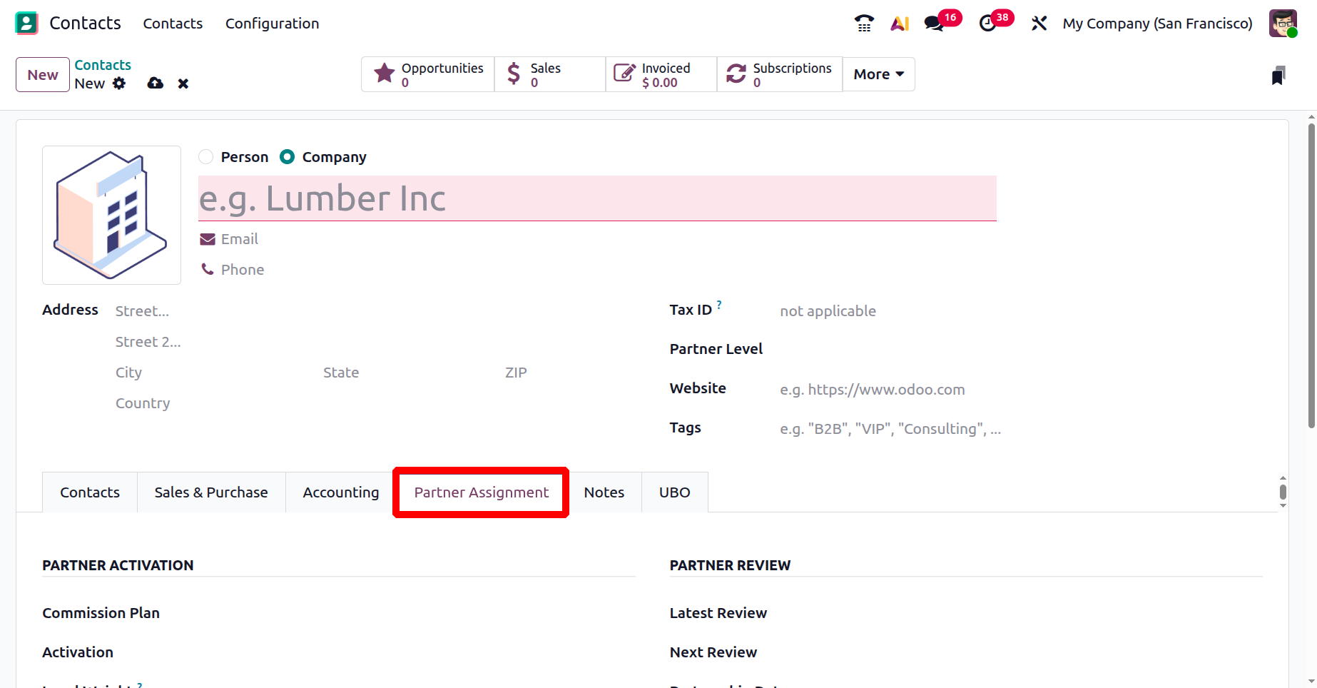 Under the Partner Assignment tab, you can configure partnership-related details. Here, you may enter the Partner Level, Commission Plan, Activation, Level Weight, Most Recent Partner Review, Most Upcoming Partner Review, and Partnership Date. These fields make it possible to evaluate and manage the business relationship with the contact more effectively, especially in long-term partnerships or reseller agreements.