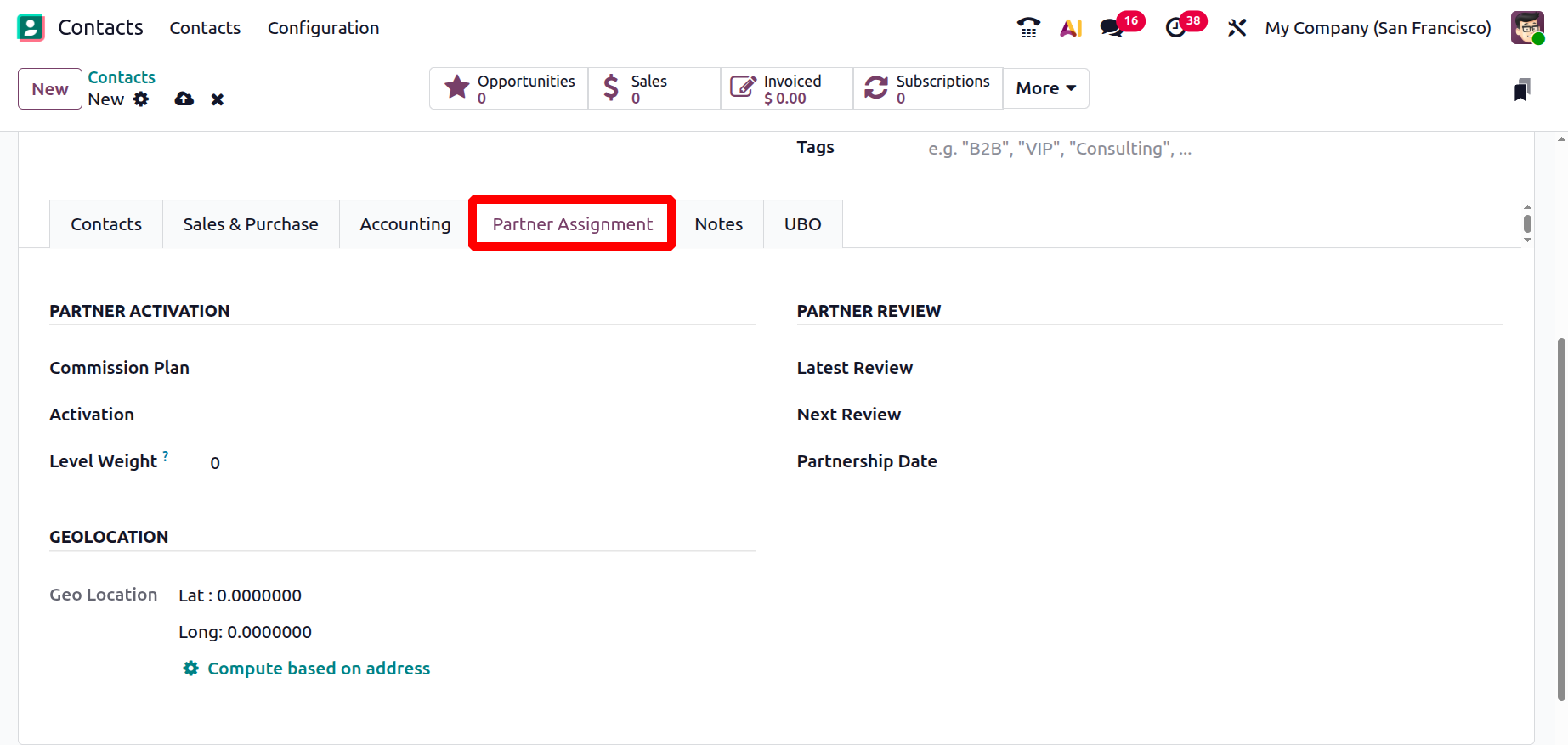 The Partner Assignment page follows, which includes additional partner-related configurations. By default, this page contains a Geolocation section, where you can define the exact location of the contact. Along with this, you will also find options for Partner Review and Partner Activation setups.