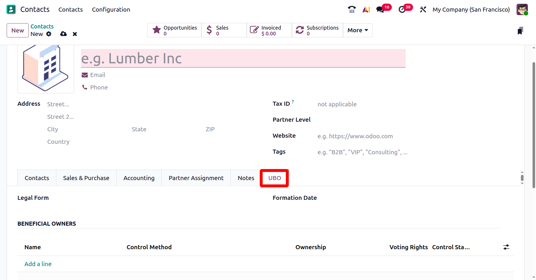 Lastly, the UBO tab in the contact form is designed to record details of the Ultimate Beneficial Owners of a company or organization. This section allows users to define the company’s legal form, formation date, and list out all beneficial owners along with their respective details. Each owner entry can include the Name, Control Method, Ownership, Voting Rights, and Control Status, ensuring compliance with ownership transparency requirements. This feature is particularly useful for businesses that need to meet regulatory standards and maintain a clear record of individuals holding significant control or interest in the company.
