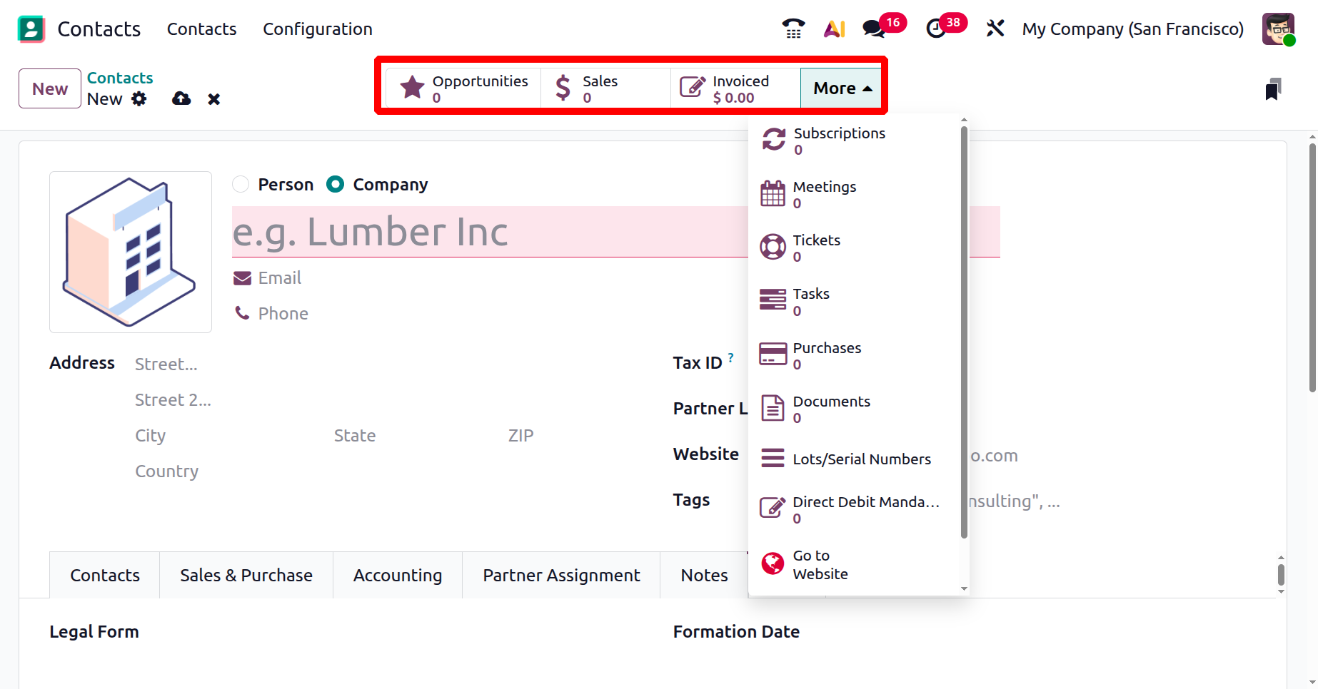 At the top of the contact form, smart buttons provide quick access to various activities and records linked to the partner. These include Opportunities, Sales, Invoices, Subscriptions, Meetings, Tickets, and Tasks, giving users an immediate overview of ongoing interactions. The More smart button expands into a drop-down menu with additional options, including Purchases, Documents, Lots/ Serial Numbers, Direct Debit Mandatory, Go to Website, and Shareholders. Among these, the Partner Ledger is especially valuable, as it offers a detailed statement of all financial transactions associated with the partner.