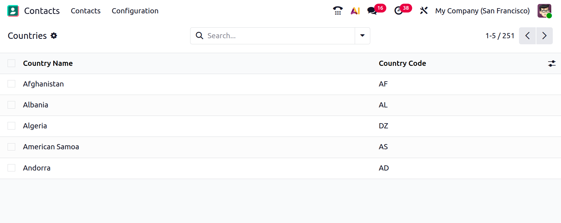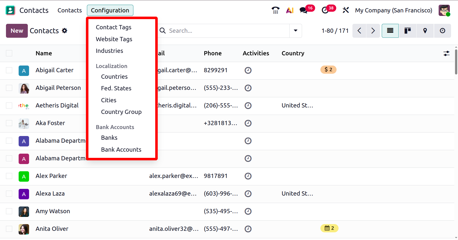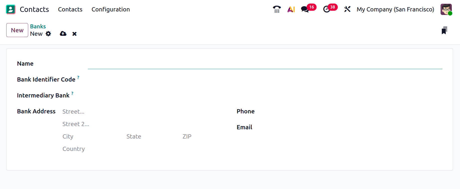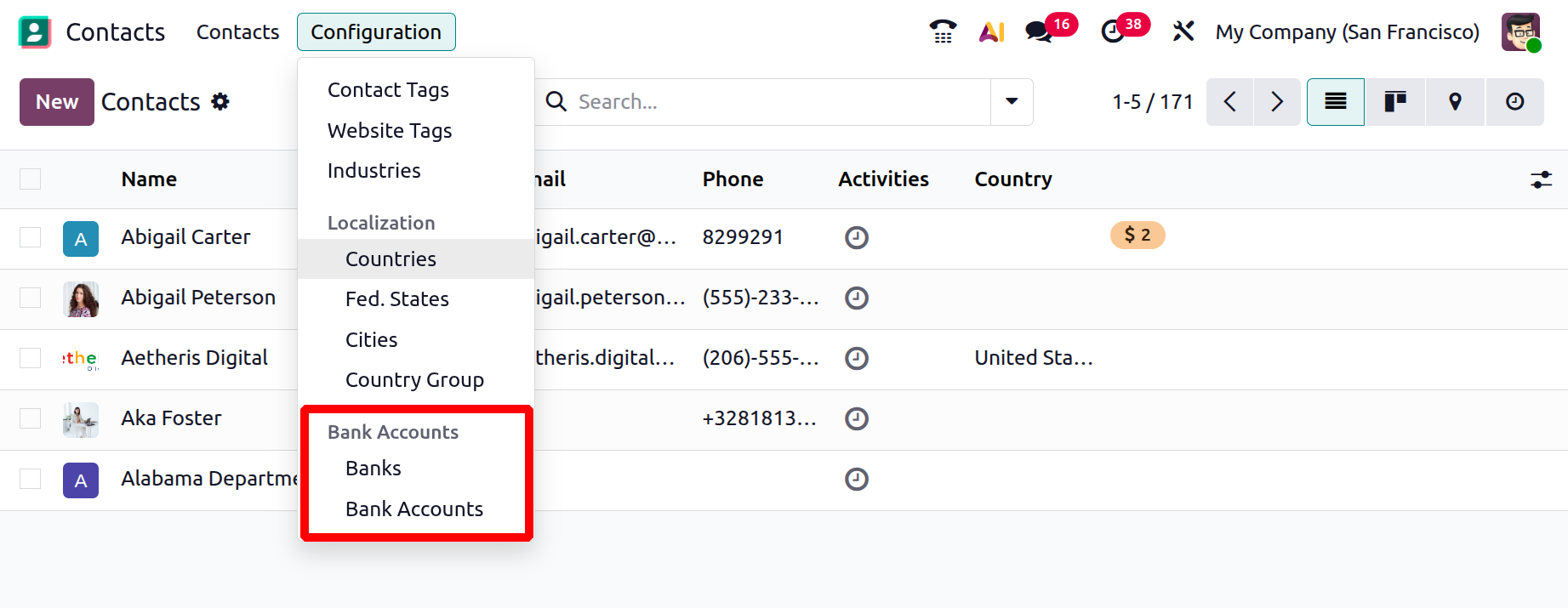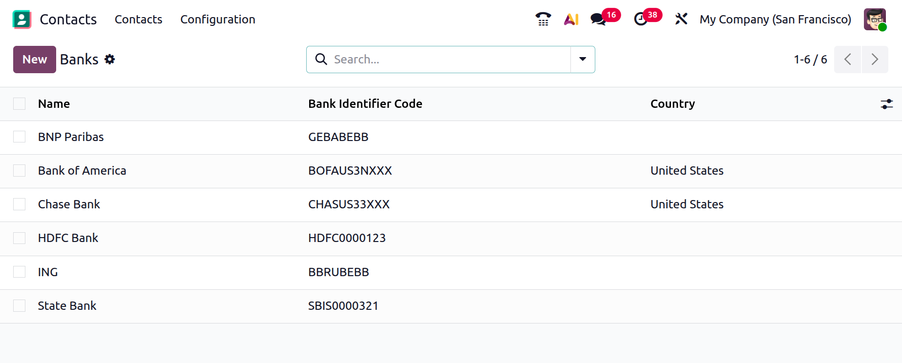 This platform allows you to store contacts’ accounts and financial details. By selecting the Bank option from the Configuration menu, you can view all the banks listed in the module.