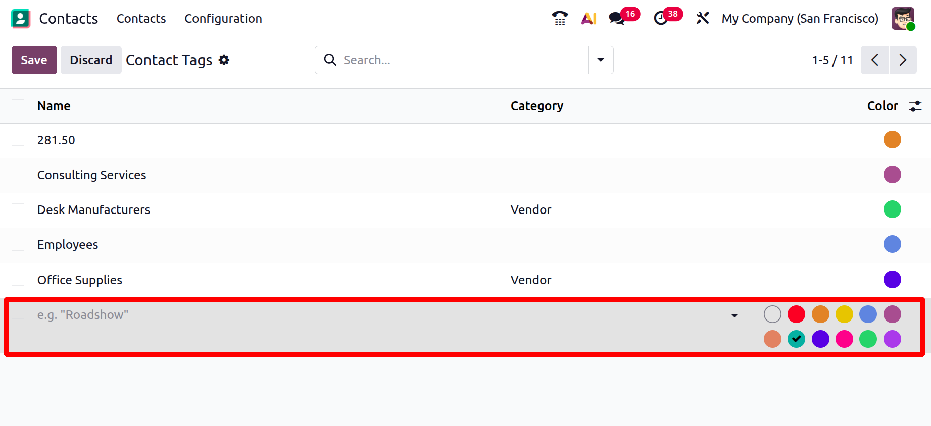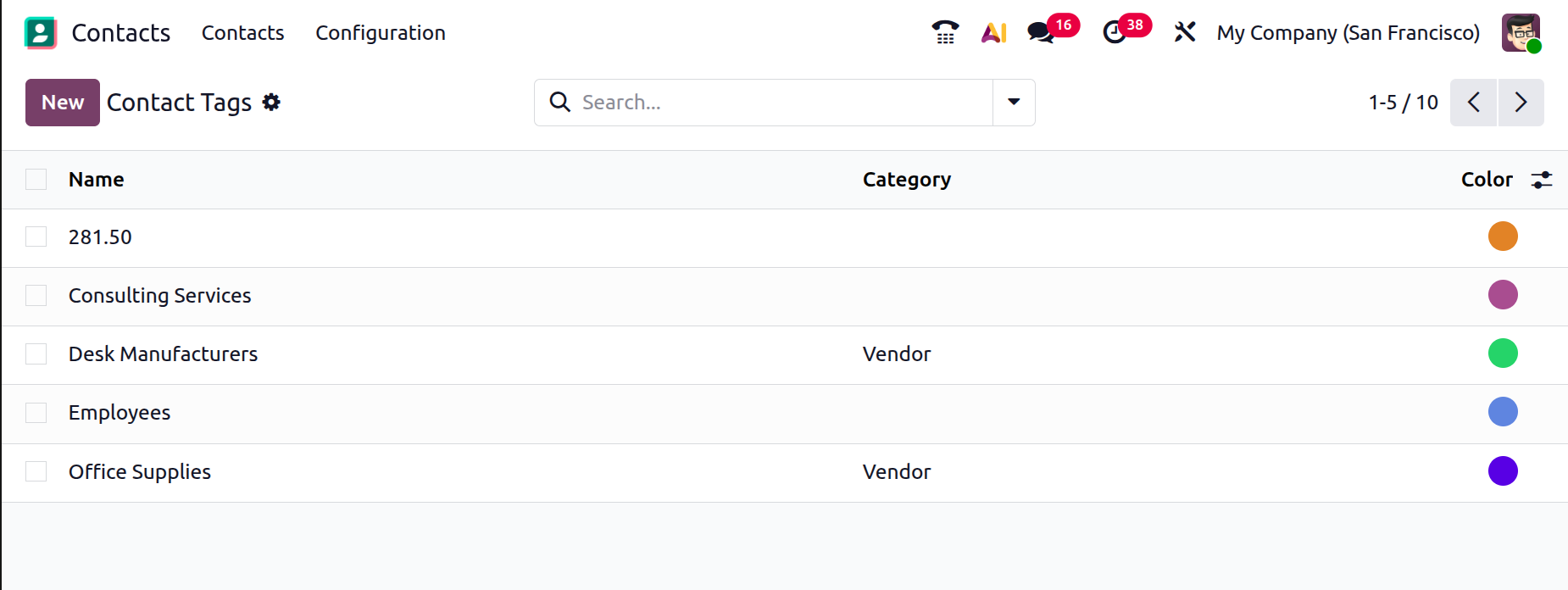 You can easily add tags to contacts from the Configuration menu. By selecting the Contact Tags option, you can view all the tags that have already been created. The list will display details such as the Display Name and the assigned Color for each tag.