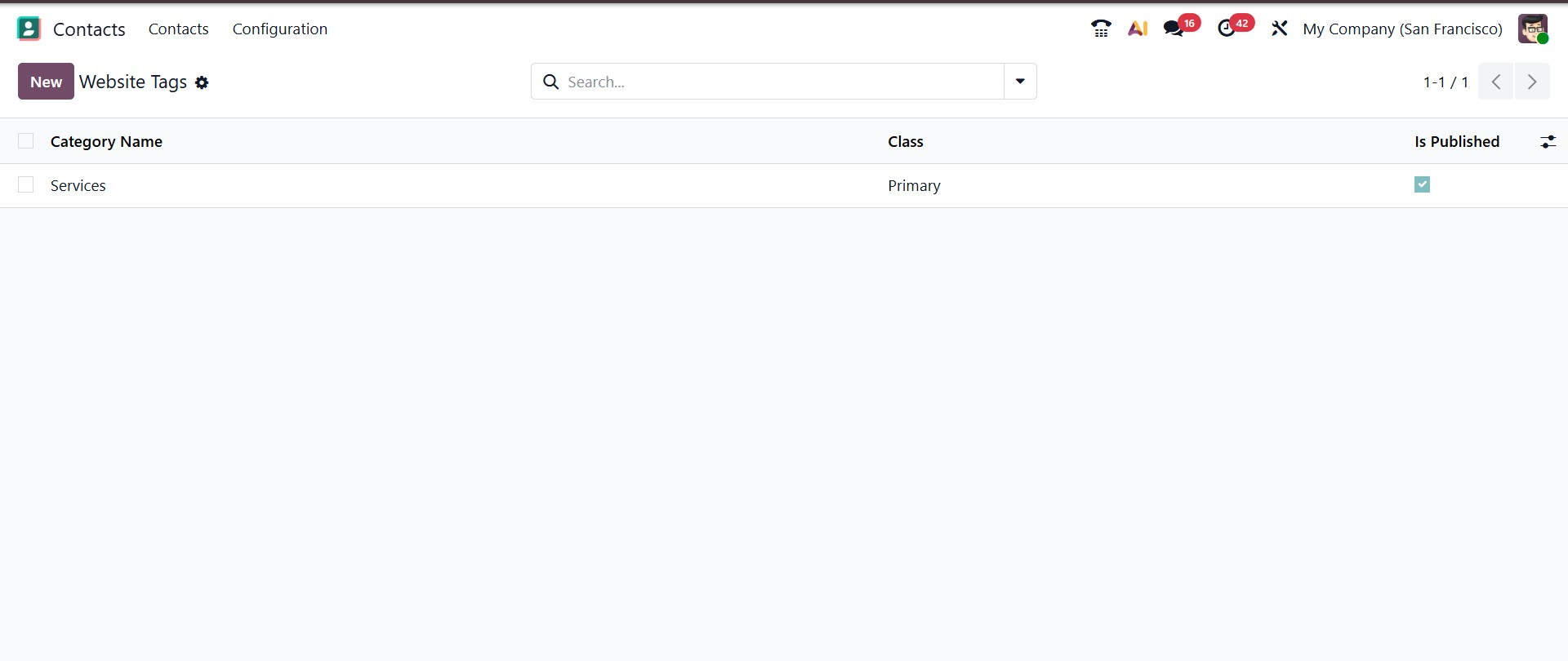 Similar to Contact Tags, you can configure Website Tags to categorize contacts for tracking and analysis. This option is available under the Configuration menu. In the Website Tags window, you will see all previously created tags. If none exist, you can create new ones by clicking the New button.
