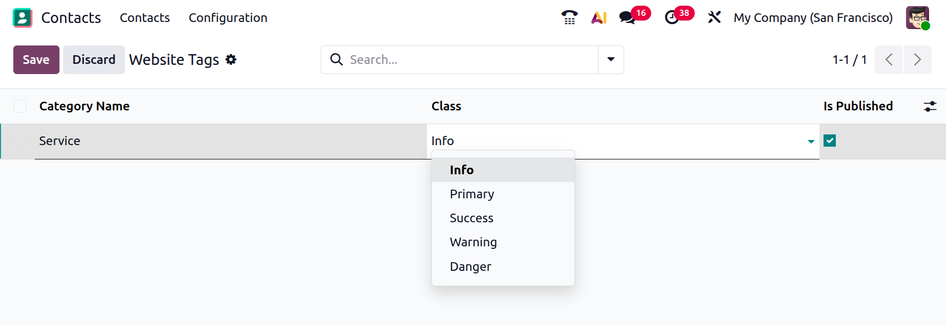 When creating a new website tag, you can enter the Category Name in the new line added to the window. From the drop-down menu, select the appropriate Class, which includes options such as Default, Primary, Success, Warning, and Danger. Once you have made your selection, click the Save button to finalize the tag.