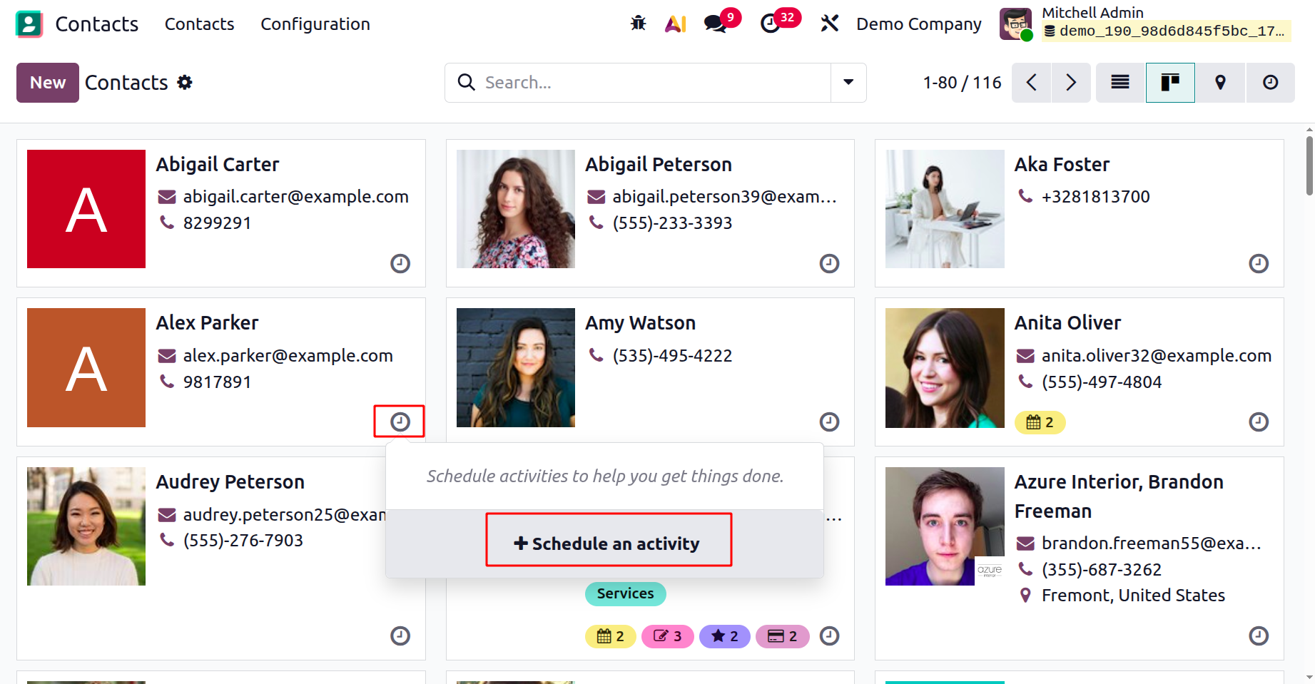 In Odoo 19, the Contacts dashboard can be viewed in Kanban format, offering a quick preview of the stored contacts. As shown in the image, each contact card displays important details, including the contact’s picture and basic information. The number of Opportunities, Planned Activities, Sales Orders, Shopping Carts, and Purchases on each tab may be indicated by little icons. By clicking on the small clock icon, you can arrange a meeting with the chosen contact, as in the image below.