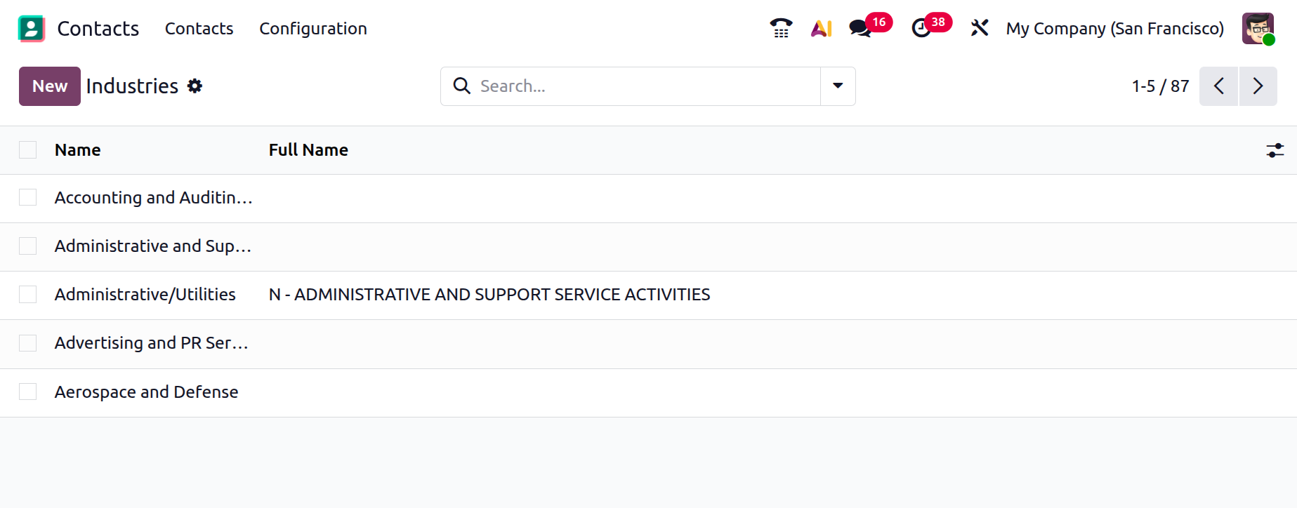 When creating a new contact in the Contacts module, you may sometimes need to assign an industry. In such cases, you can easily manage this by selecting the Industries option from the Configuration menu. This will open a window displaying a list of industries that have already been pre-configured in the system.