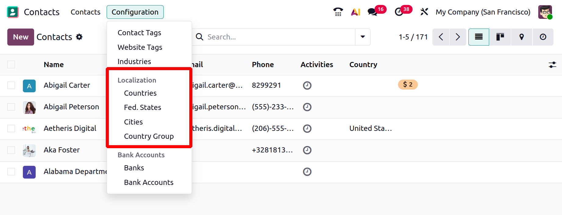 In the Configuration menu, under the Localization tab, you can find options to view the configured countries, States, cities, and country groups.