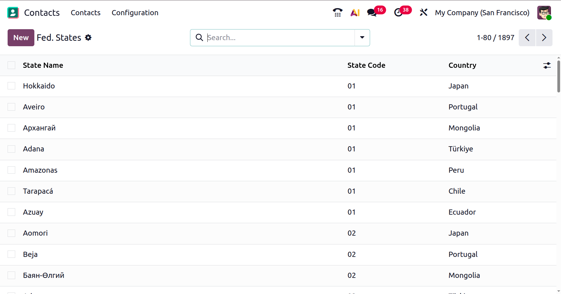 The Fed States list shows the State Name, State Code, and Country. You can add more states to this list by clicking the New button.
