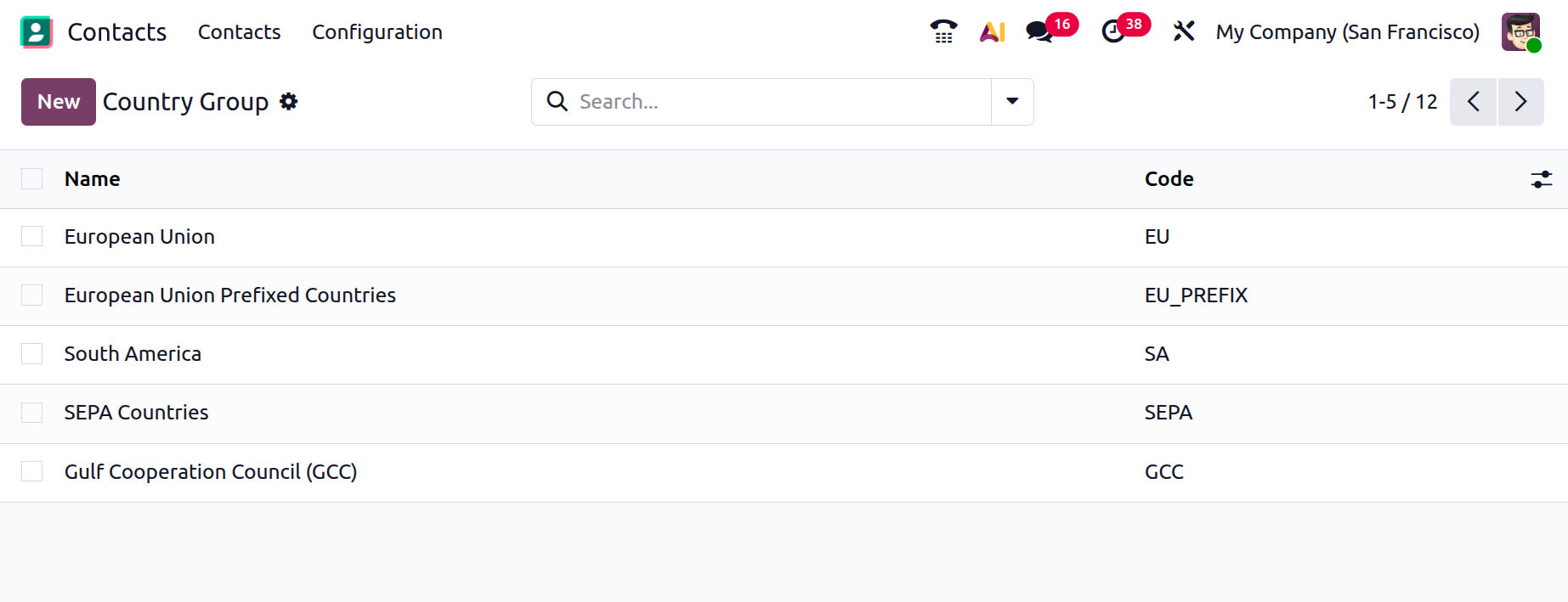In the Contact module, the corresponding menu displays the names of the Country Groups. You can add a new country group to the list by clicking the New button.