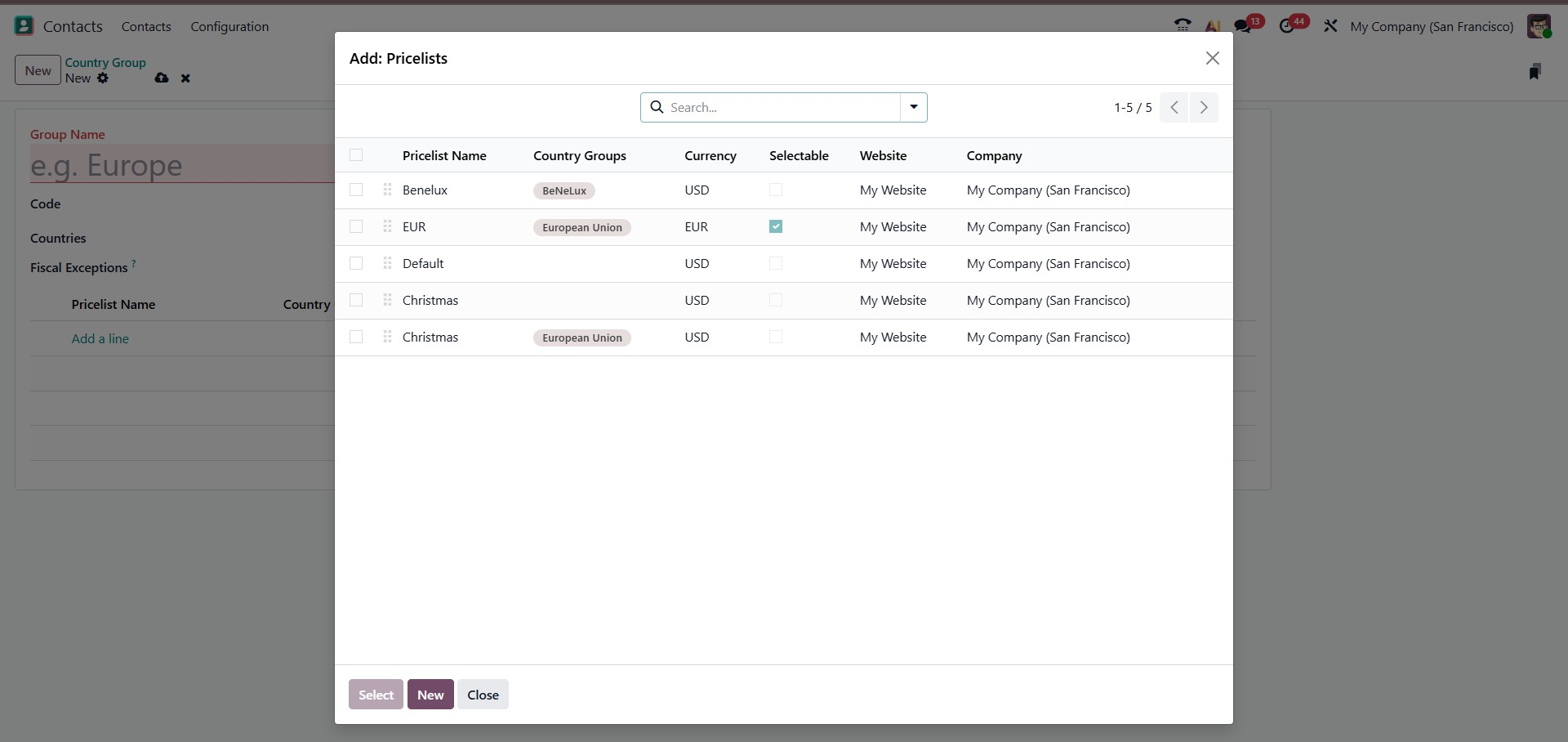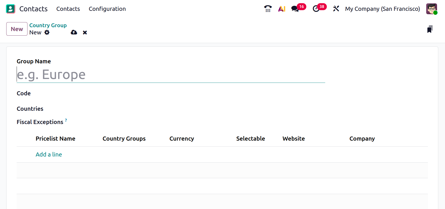 Here, you can enter the group name and then select the countries. Using the Add a Line option, you can include details such as pricelist name, country groups, currency, selectable, website, and company.