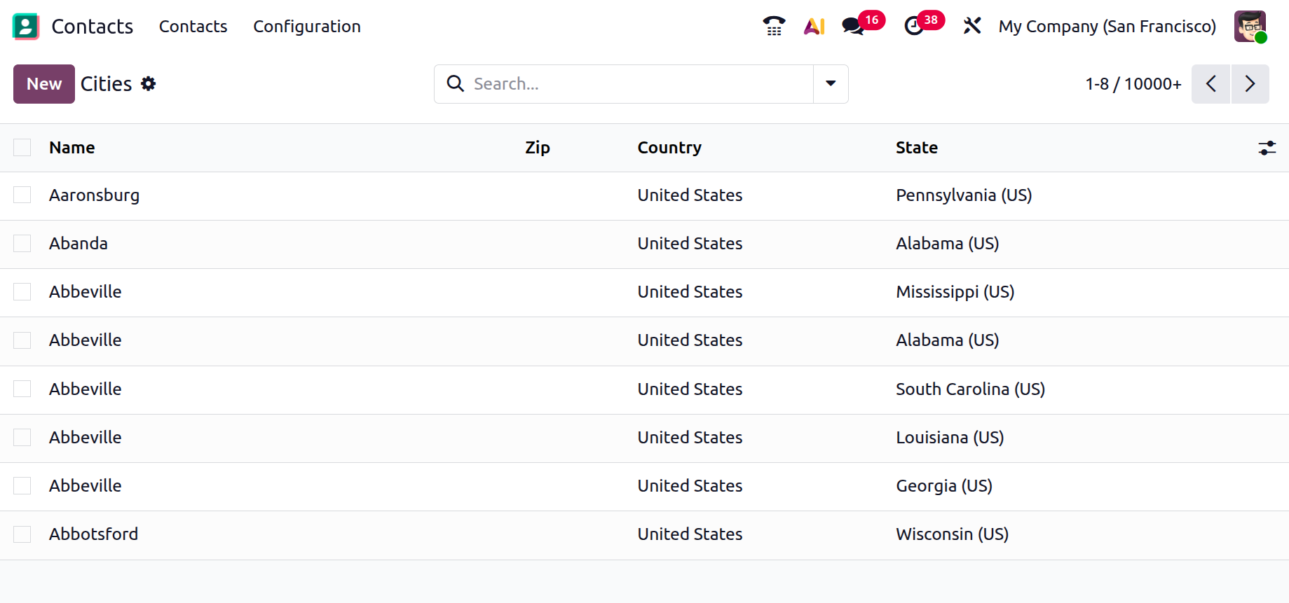 Here, you will see a list of city names. To add a new city, click the New icon.