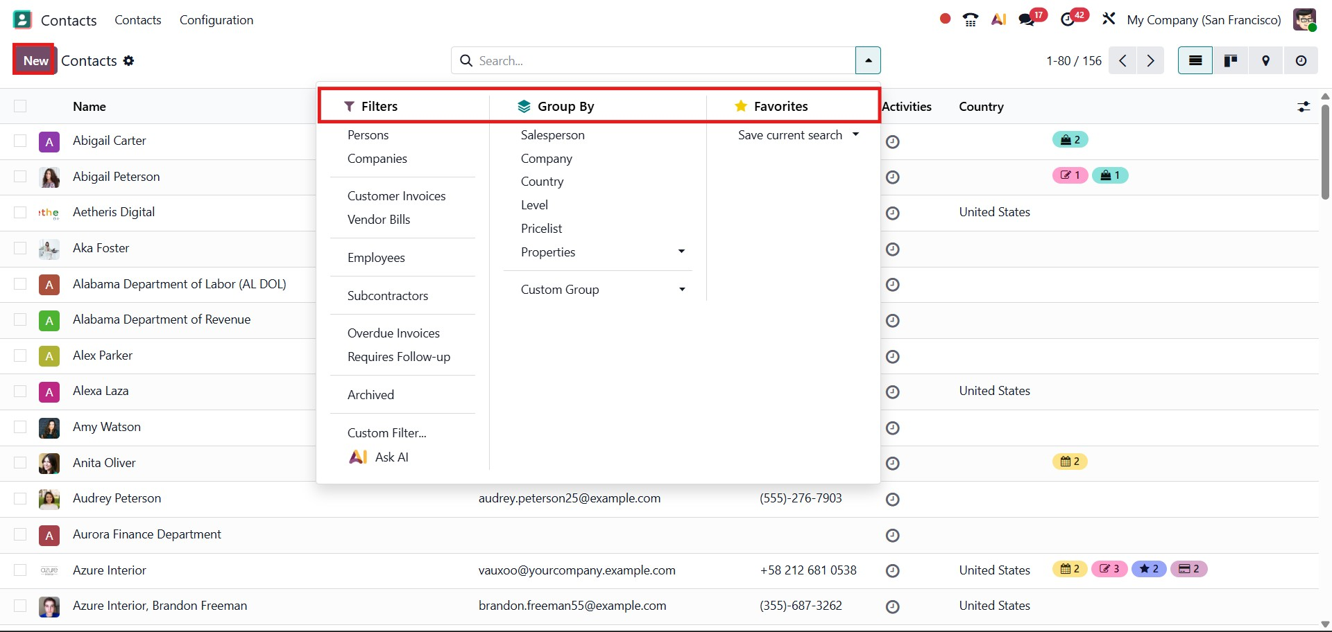 The Filters option in the Contacts module provides several choices to refine your search results. You can filter contacts as Persons, Companies, Customer Invoices, Vendor Bills, Employees, Subcontractors, Overdue Invoices, Requires Follow-up, Archived, Custom filter, or Ask AI. These filters make it simple to locate specific records without manually browsing through the entire list.