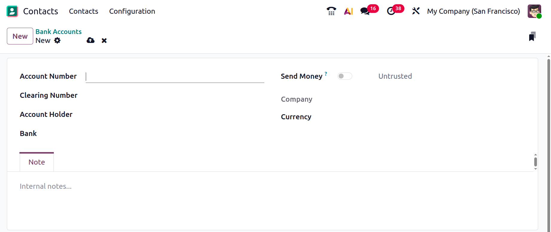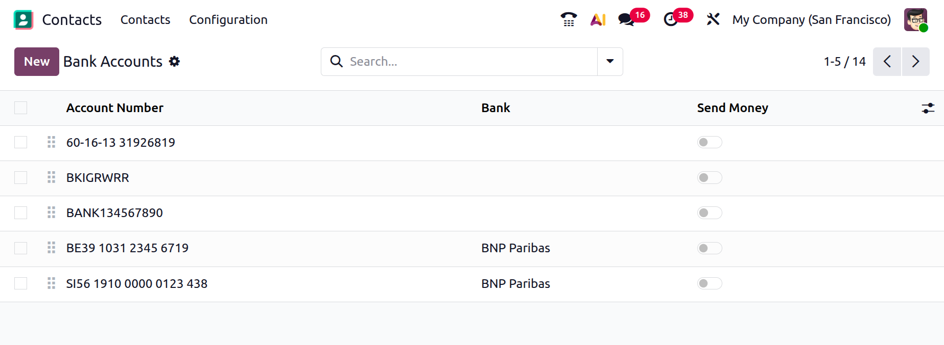 In the list view, bank accounts are displayed with details such as Account Number, Name, Company, Account Holder, and Send Money status. To add another bank account for a contact, click the New button, which will open a new form view.